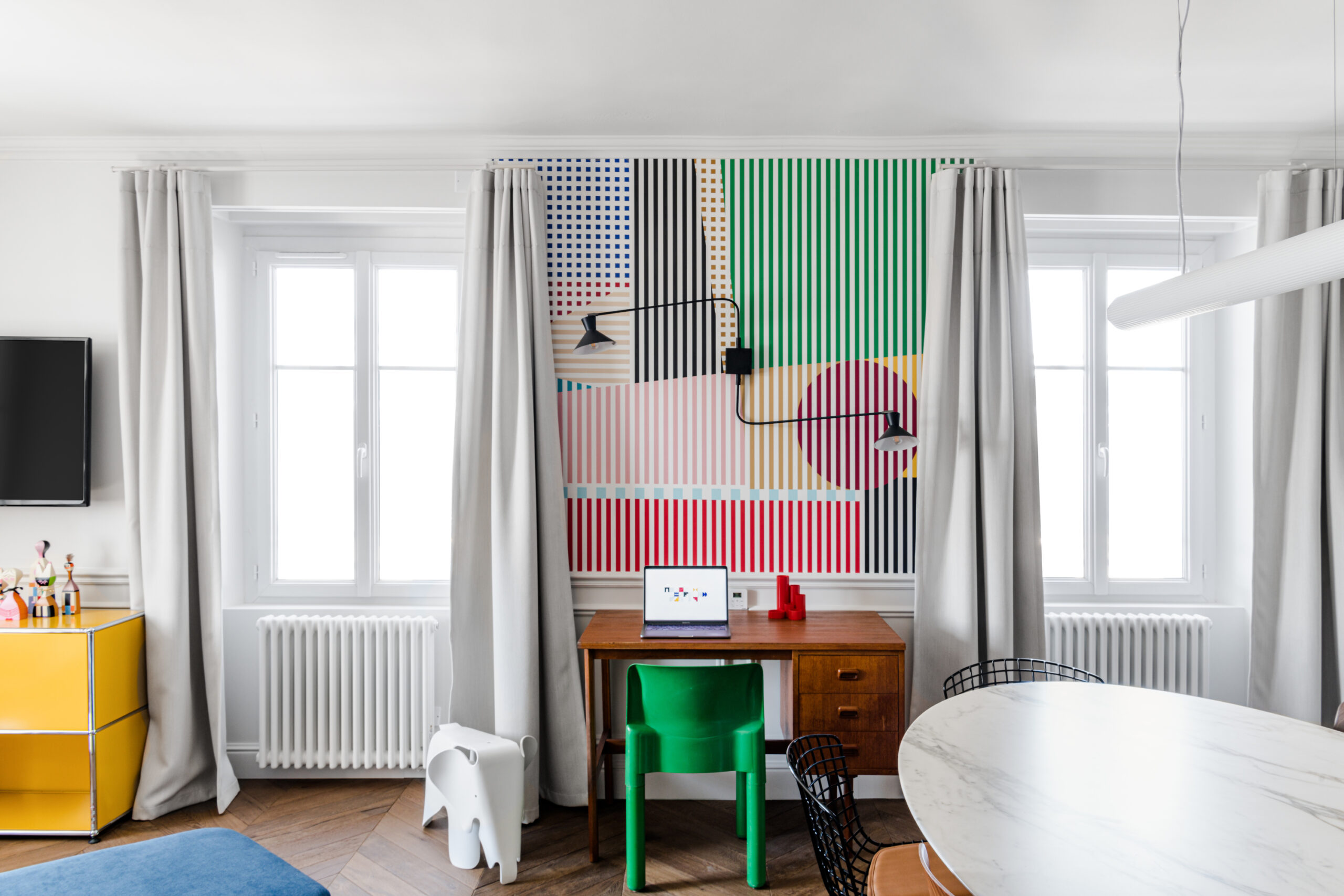 … like this wooden desk and its iconic chair by Kartell, with its minty green color that breathes lightness into the room.