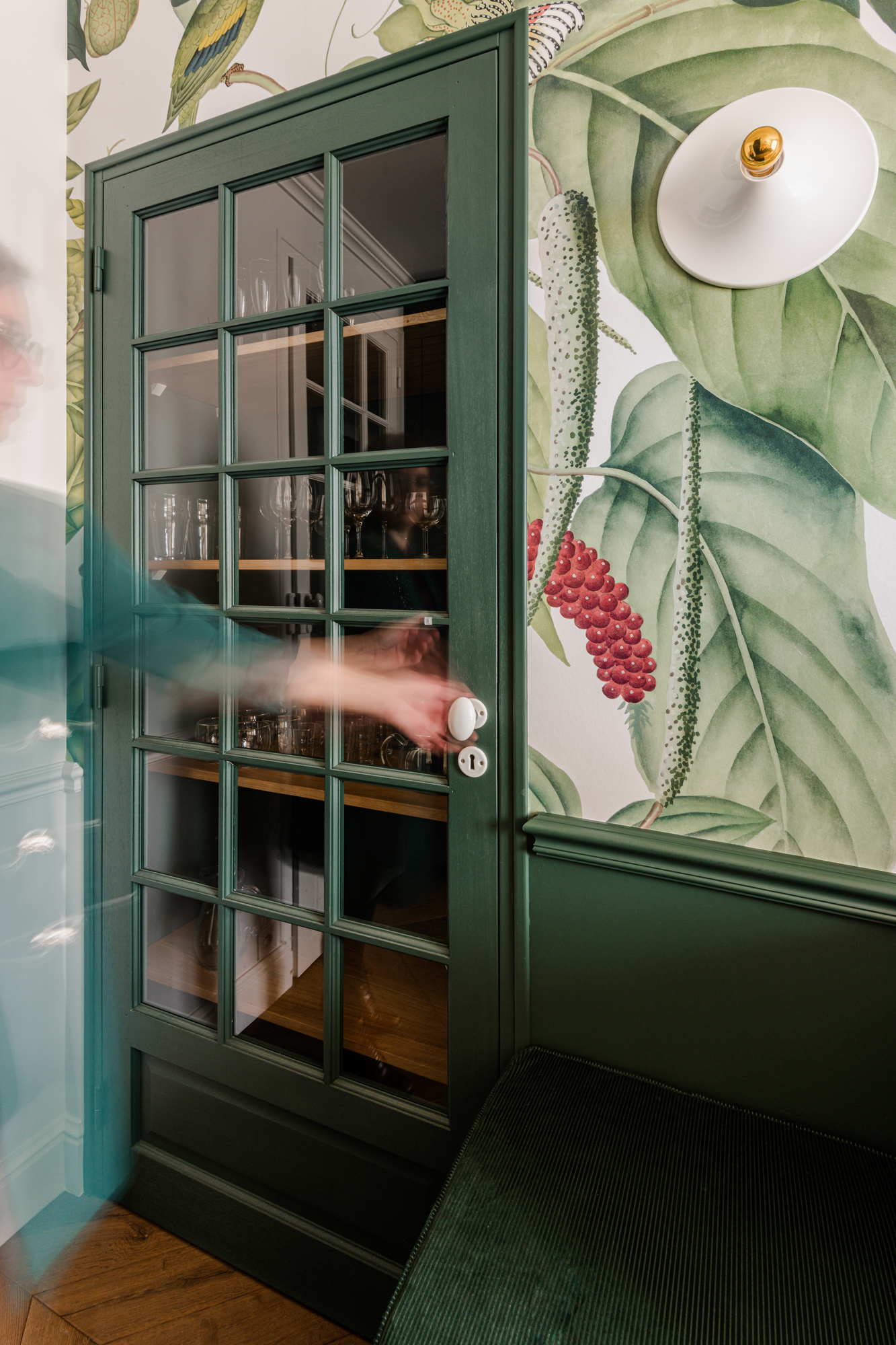 … while a former broom closet is transformed into a glazed dresser, entirely painted in dark green.