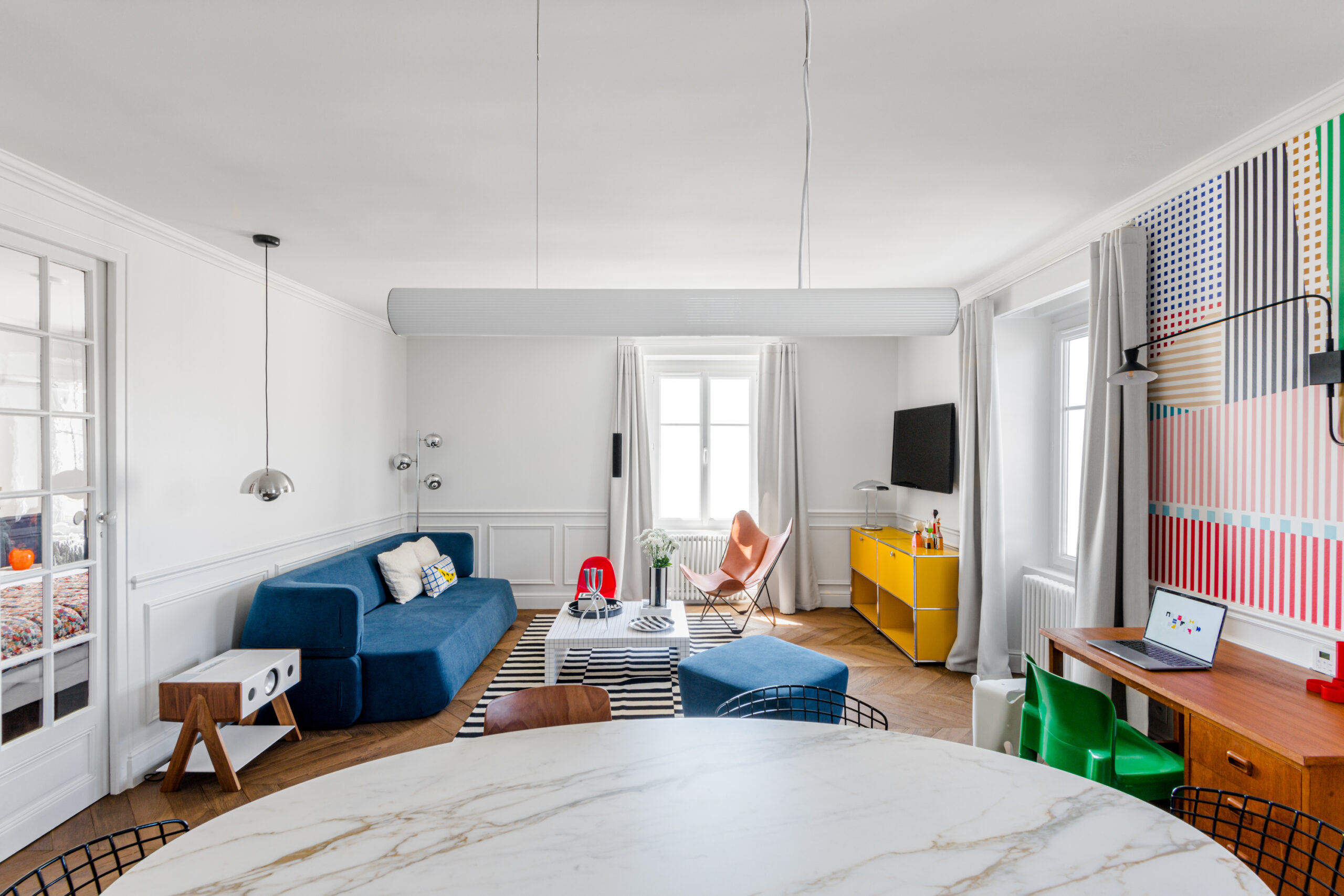 Nestled in Saint-Malo’s iconic Grand Hôtel Franklin, the rental apartment has been renovated to recapture its old-fashioned charm, while adding modern comfort. In the vast living room, herringbone parquet flooring, moldings and cornices have been recreated by Orac Decor for a cheerfully colorful decor.