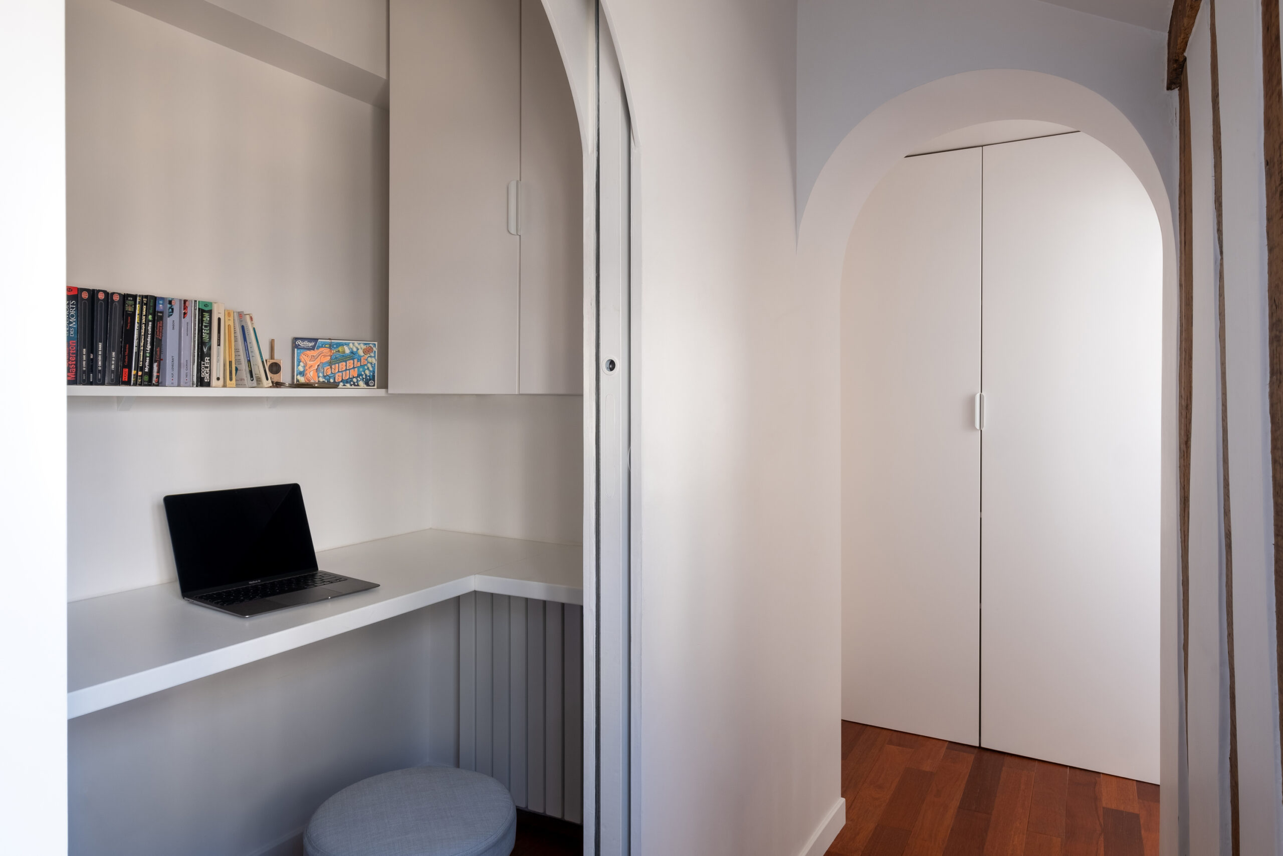 For once, the office area is at the forefront. Installed in a former bathroom, it is isolated from the rest of the apartment by numerous storage cupboards, ensuring good soundproofing between the living room… and the building’s staircase.