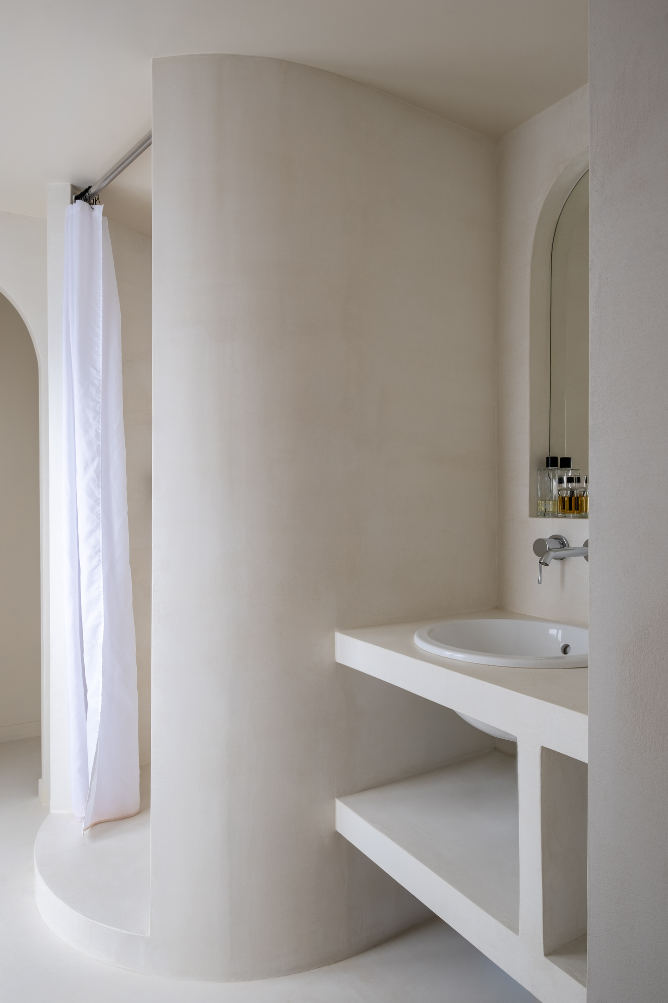 Bathed in natural light, the bathroom is all curves, giving it a very enveloping feel. Made entirely in masonry, it is covered with a light-beige waxed concrete from Marius Aurenti, which lends elegance and serenity to the whole.