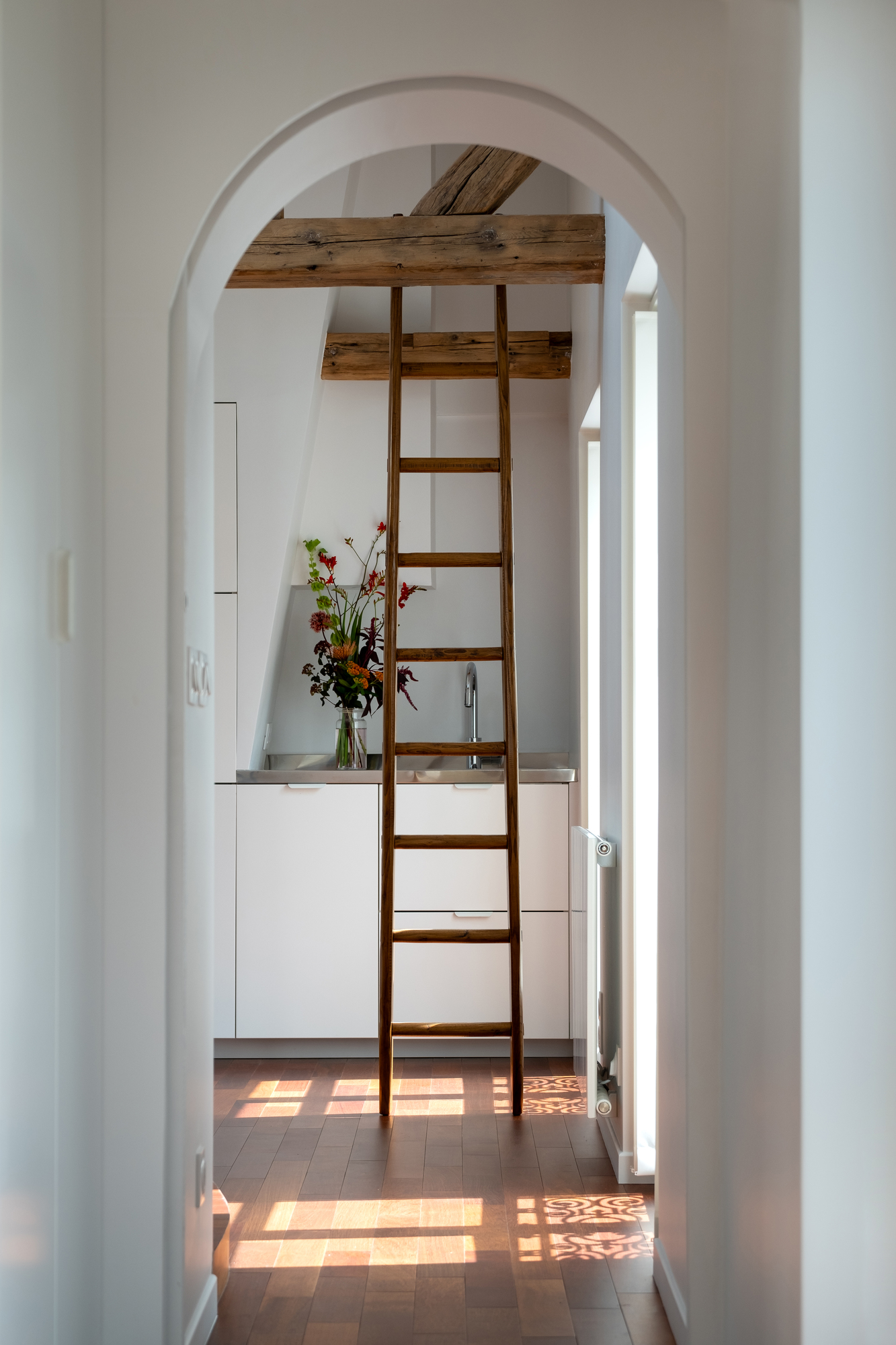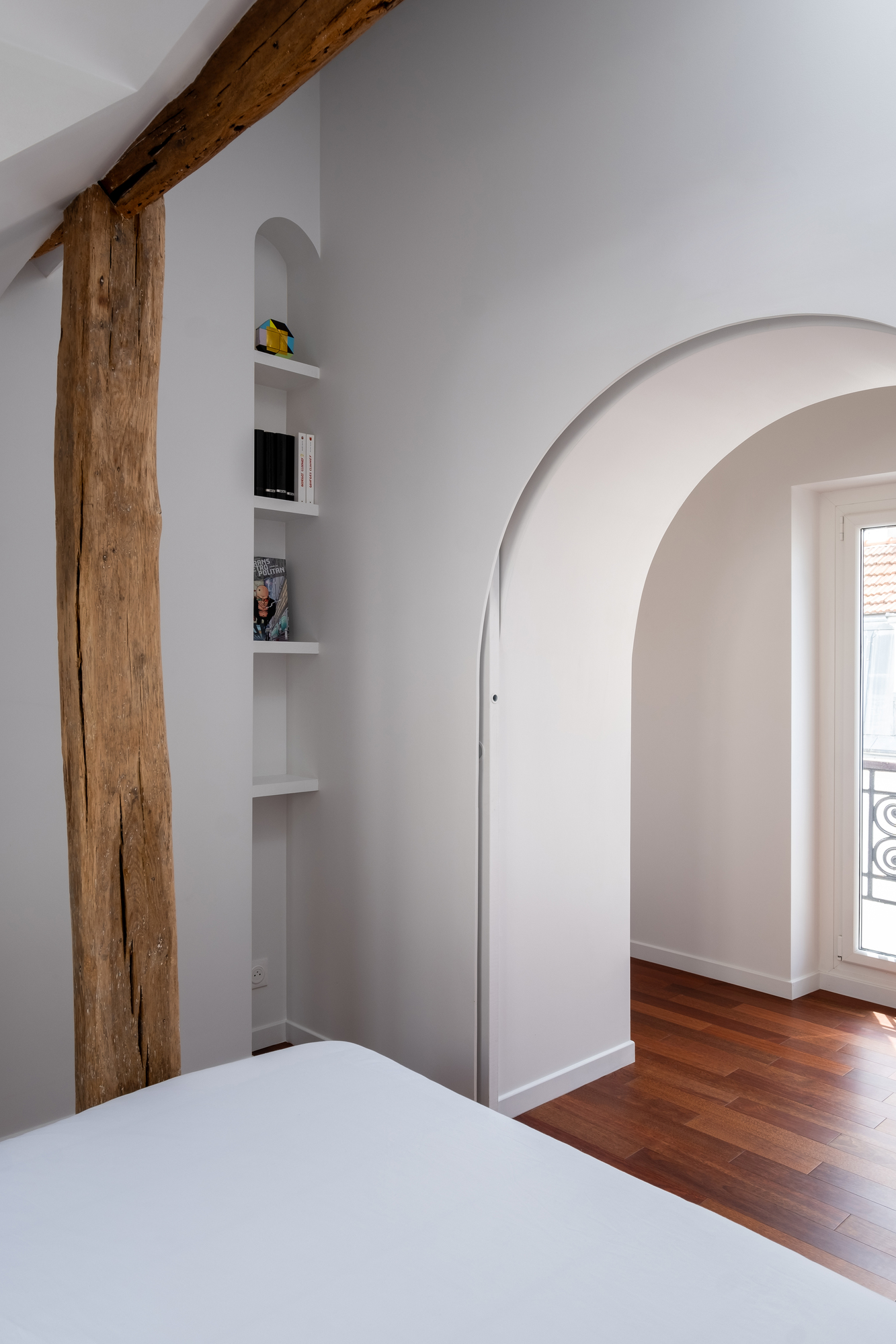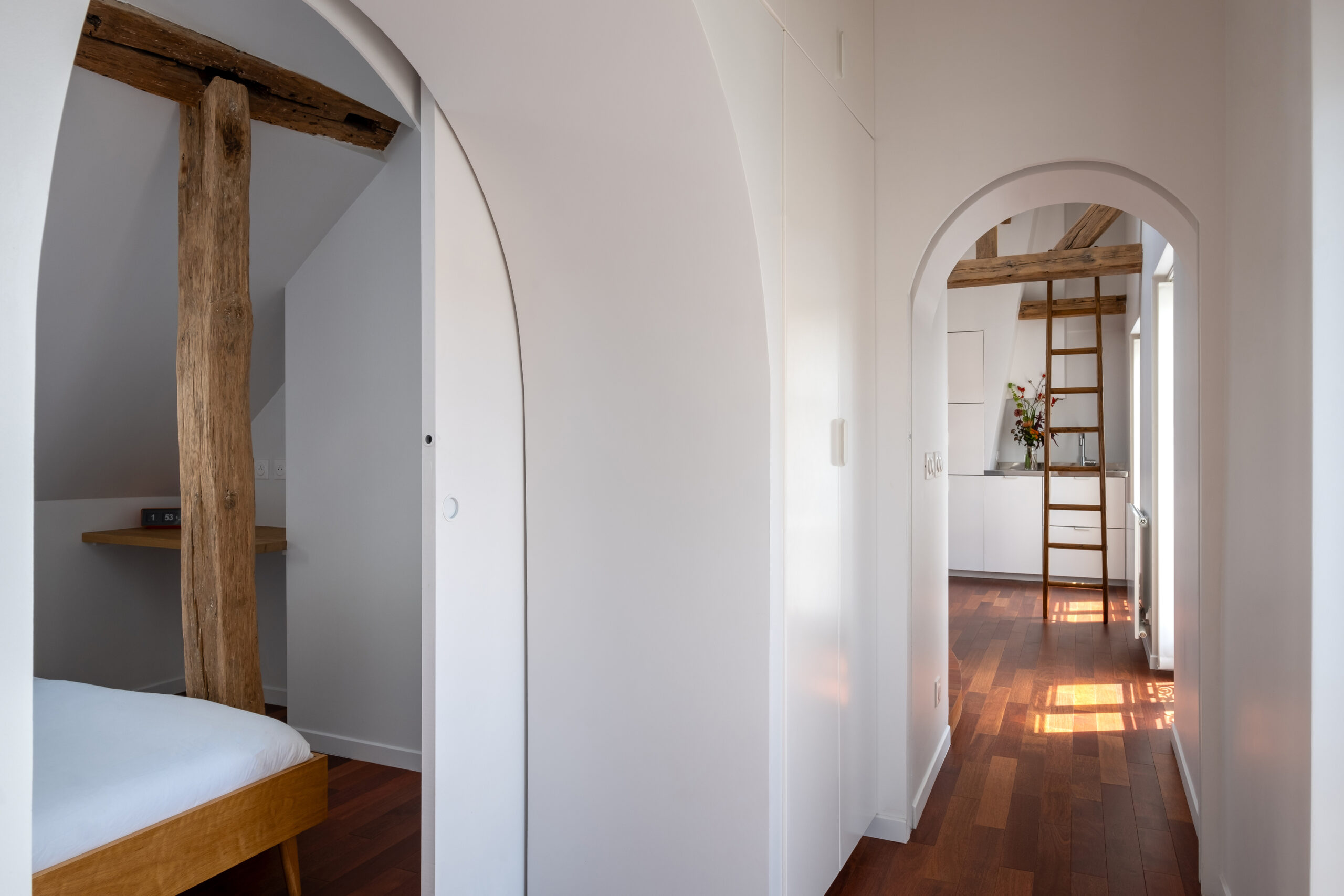 Angled partitions, arched openings… Laura Loutsau plays with shapes… but not with colors! In fact, she deliberately favors white tones to highlight the existing space, as well as her customer’s furniture and objects.