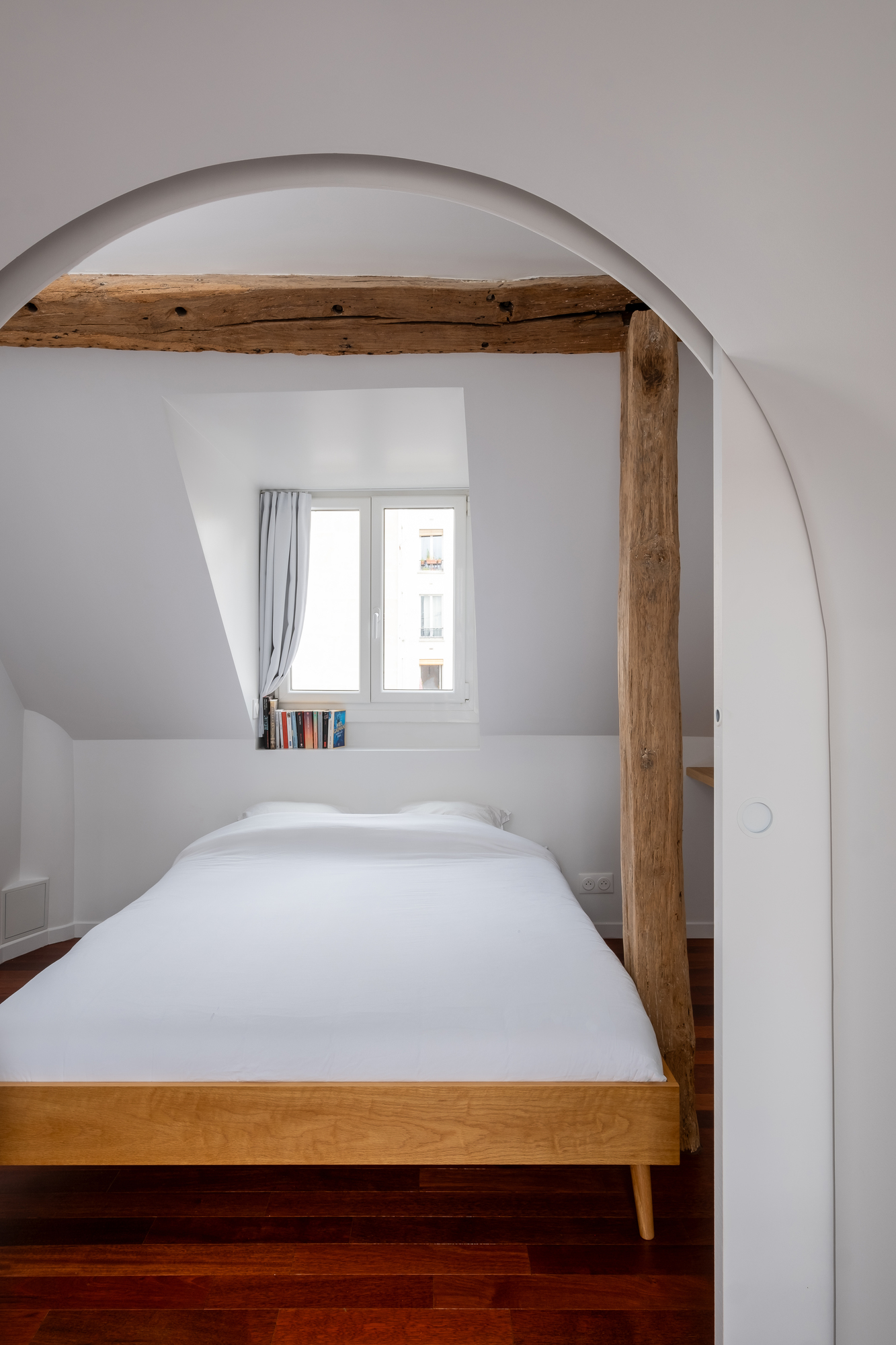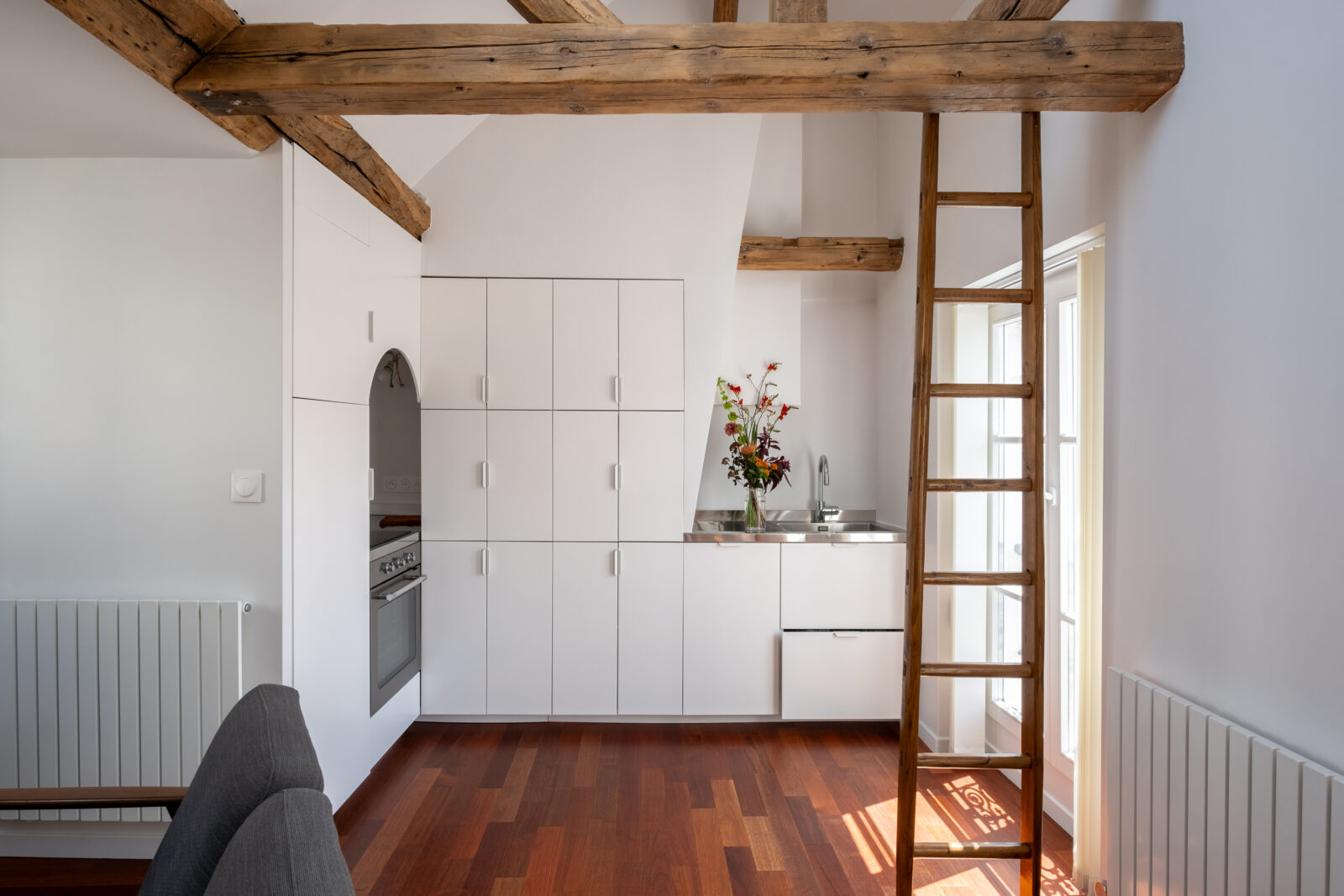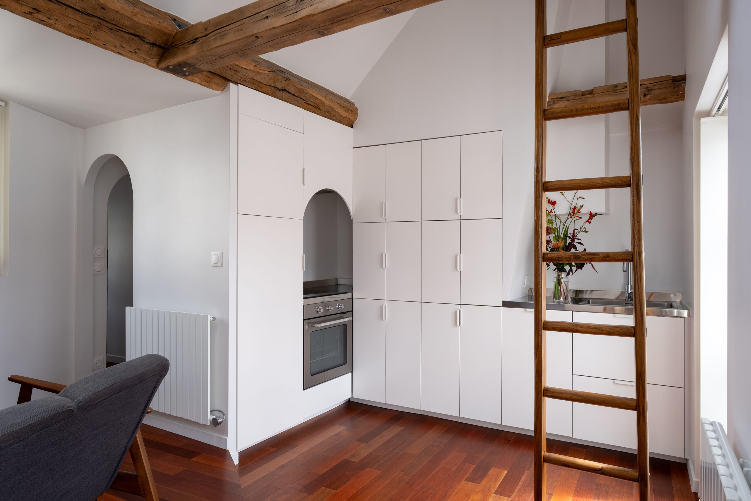 Located on the top floor of the building, this apartment benefited from beautiful volumes, which until now had been cluttered by the presence of high storage units. Laura Loustau decided to open up the space to restore the cathedral ceilings and highlight the beams, which were sandblasted and treated to restore their original color.