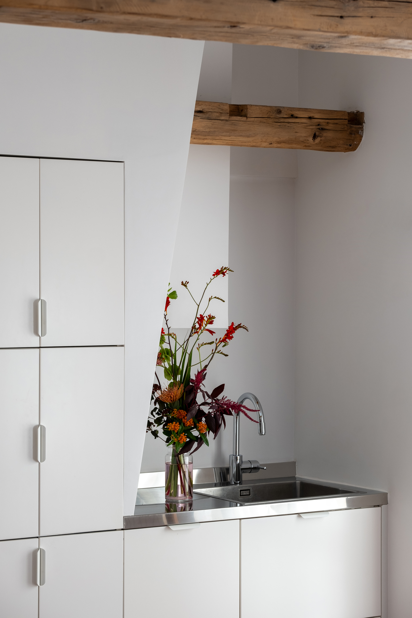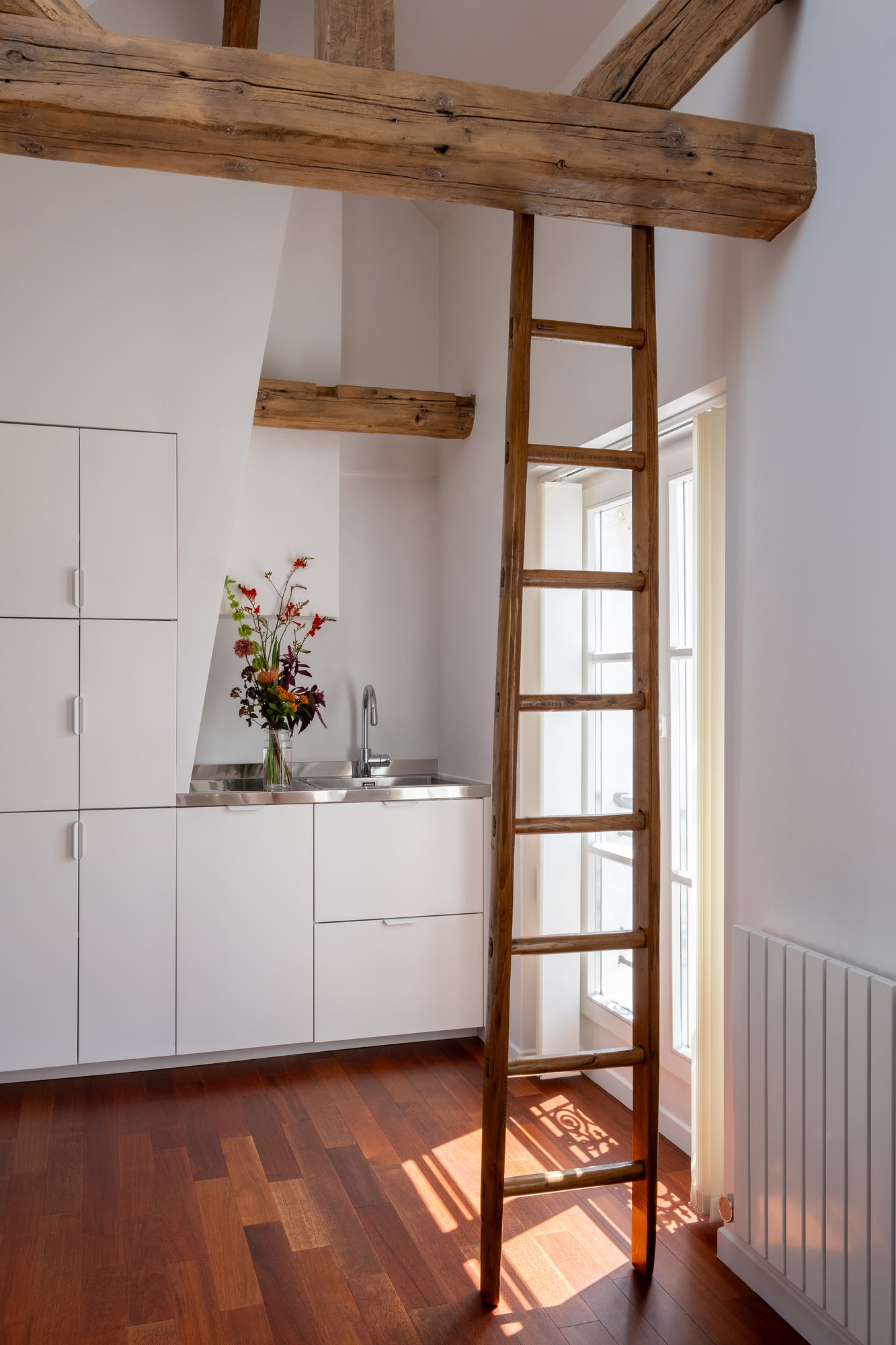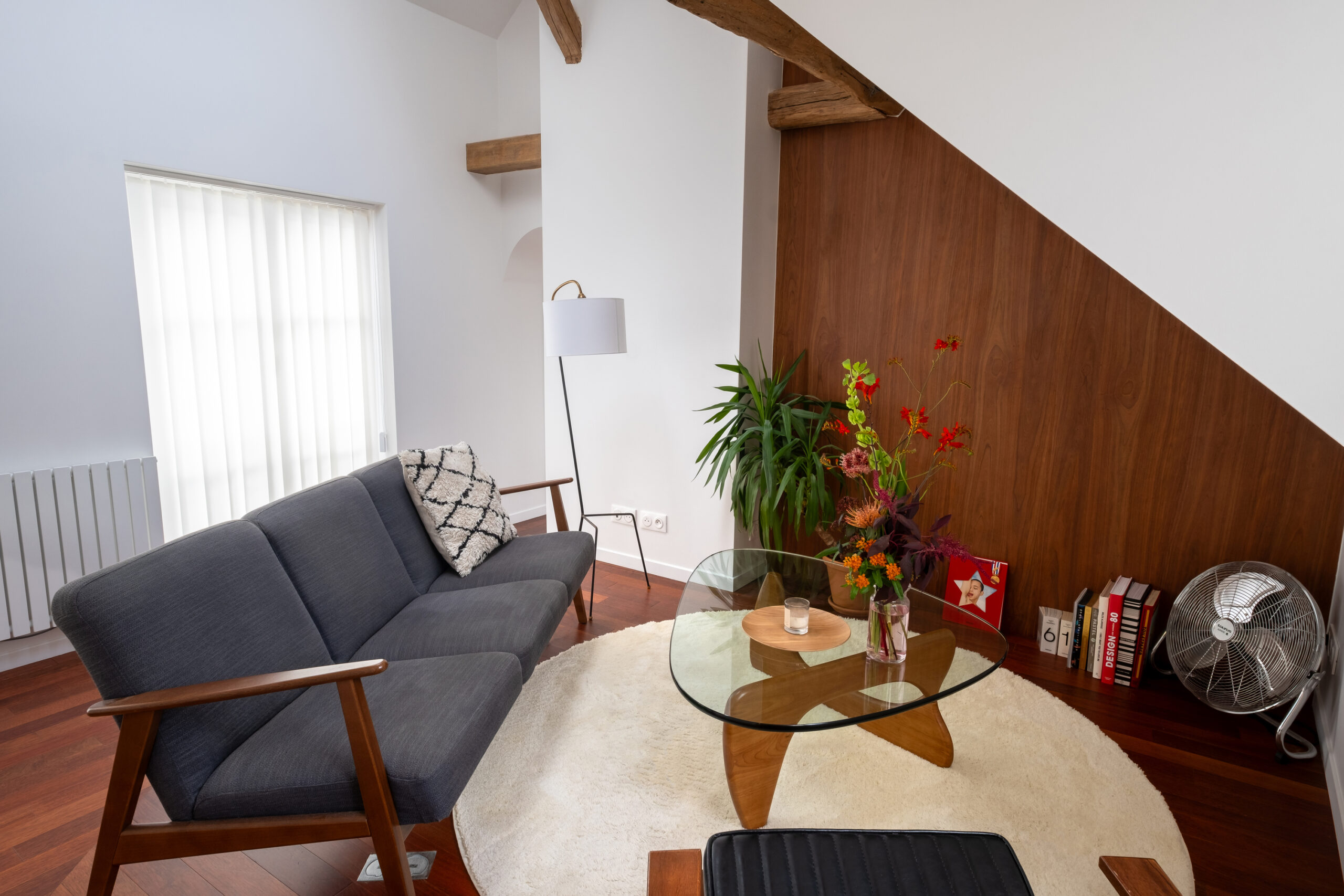 Located on the top floor of the building, this apartment benefited from beautiful volumes, which until now had been cluttered by the presence of high storage units. Laura Loustau decided to open up the space to restore the cathedral ceilings and highlight the beams, which were sandblasted and treated to restore their original color.