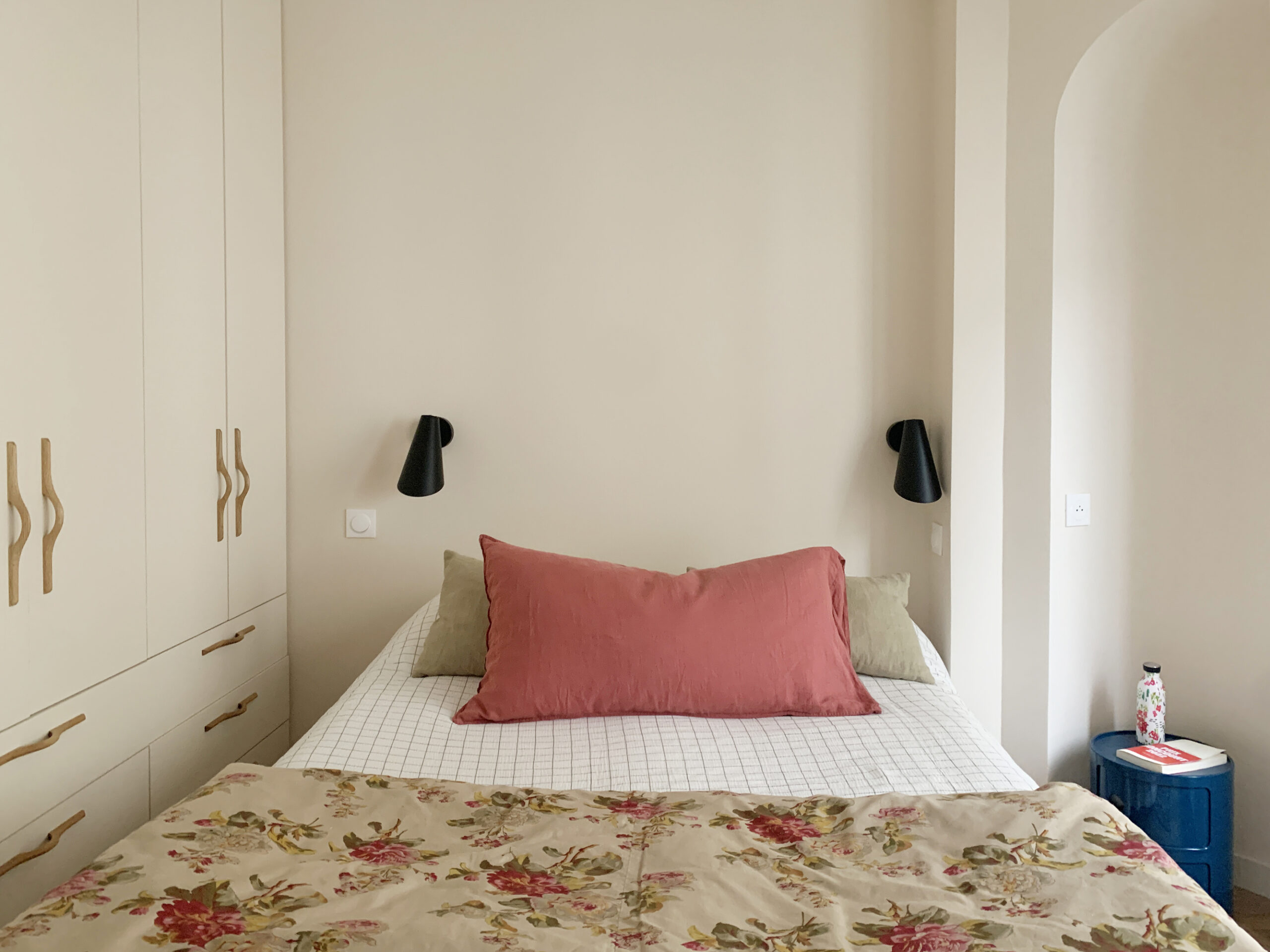 Custom-designed built-in storage maximizes space in this compact bedroom. We love the original alcove, which adds roundness and elegance, while enveloping the bedside table.