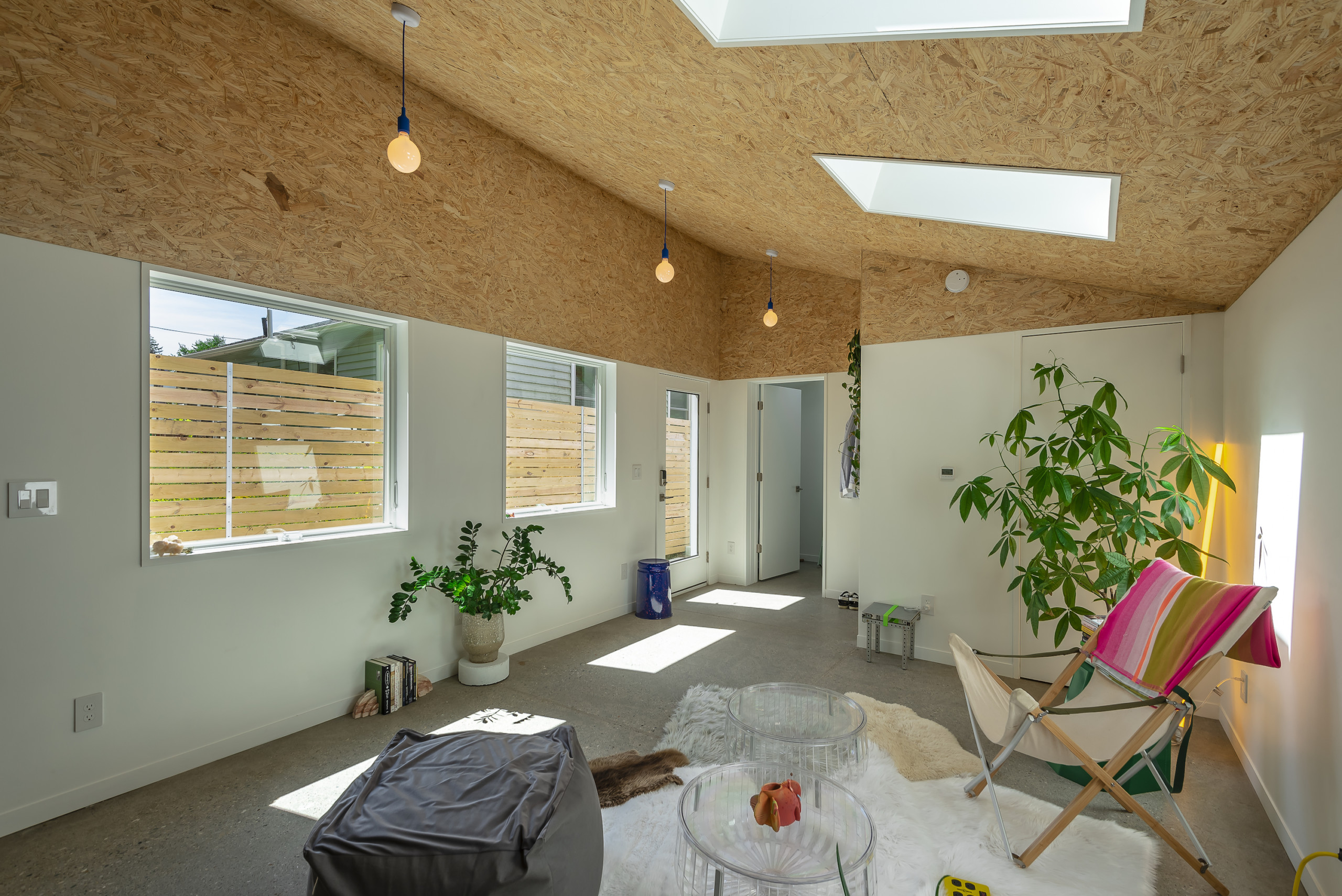 The external insulation is complemented on the inside by OSB boards, which become fully-fledged decorative elements. The evidence being their perfect marriage with these Muuto pendant lights.