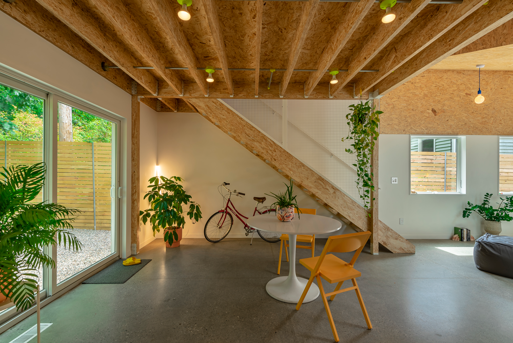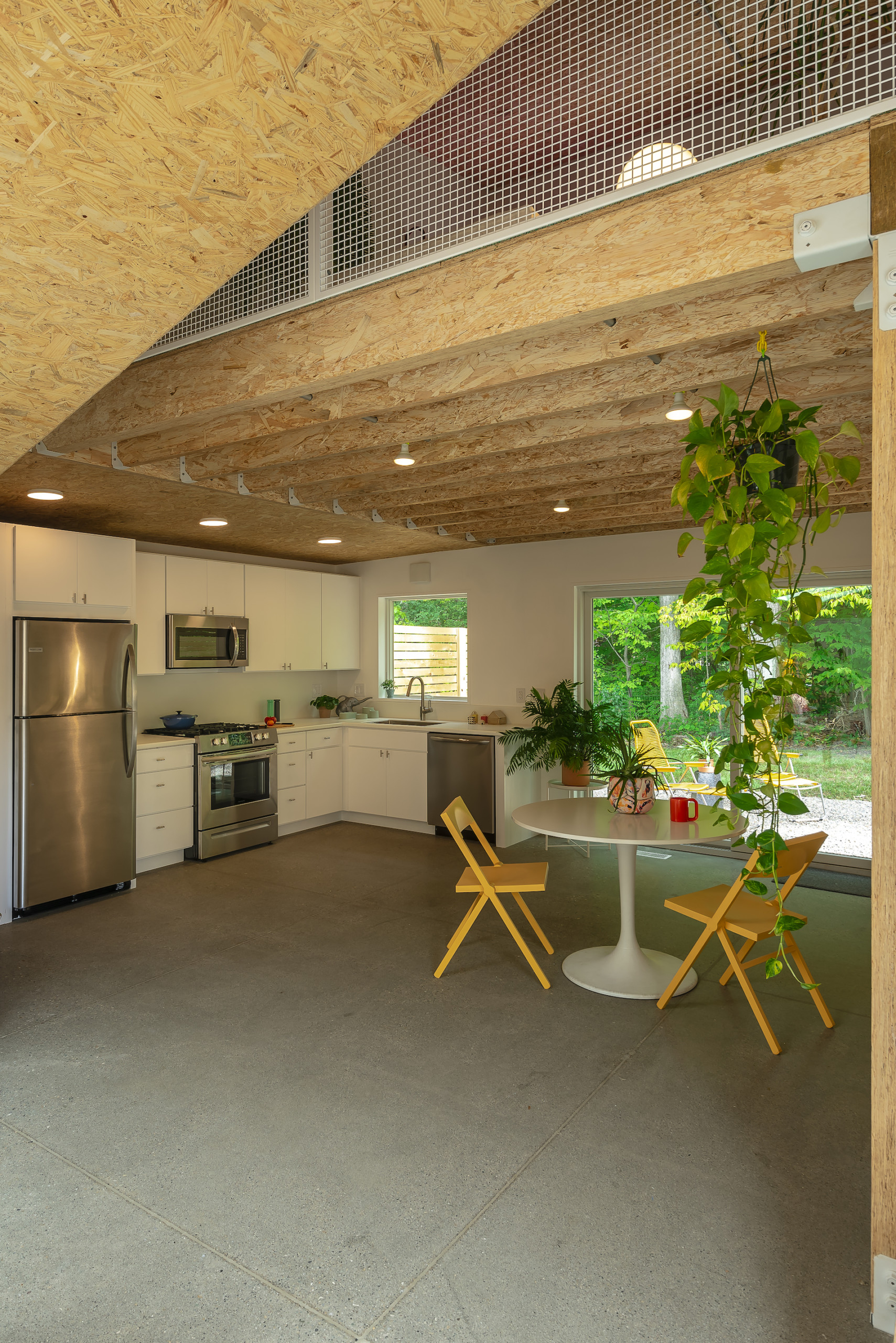A large dining area that remains minimalist, in the style of a guest house. The joists add character and visual texture.