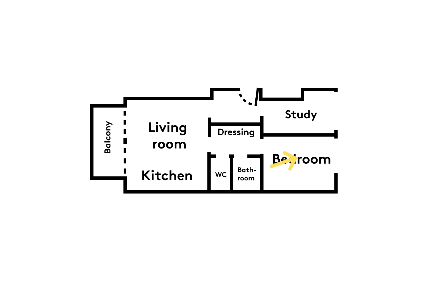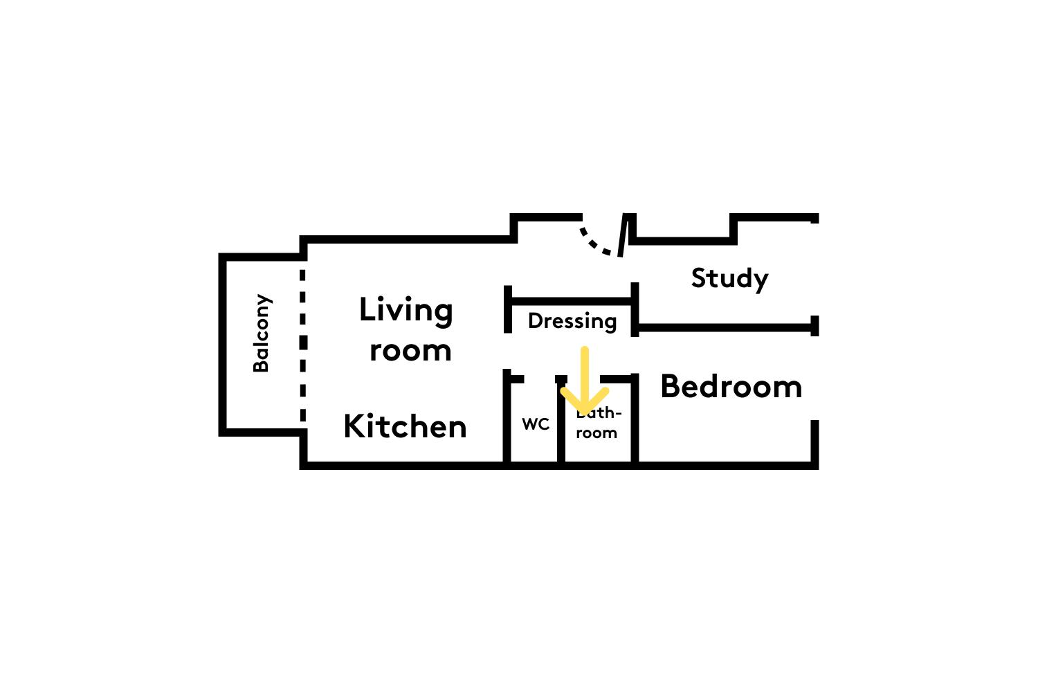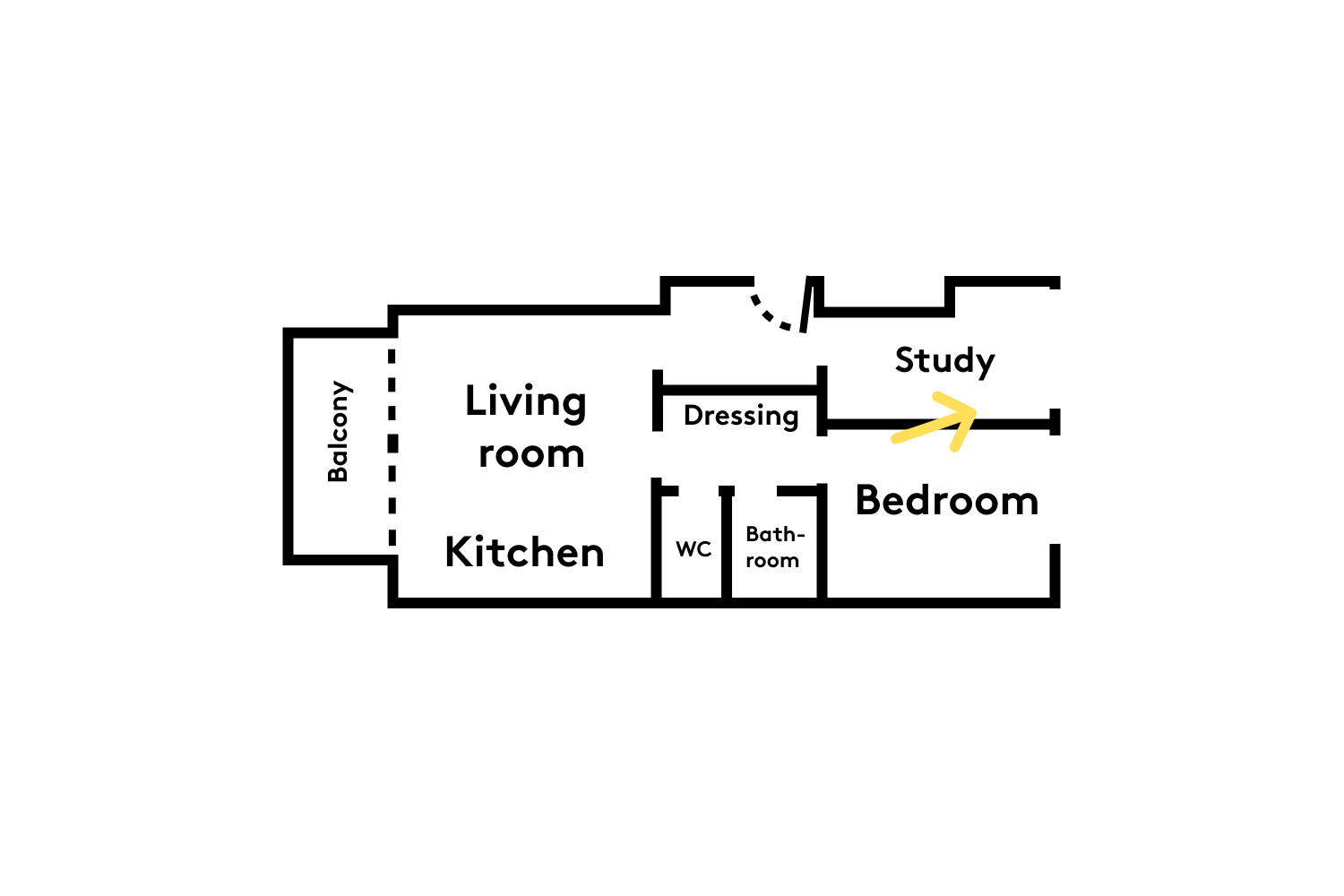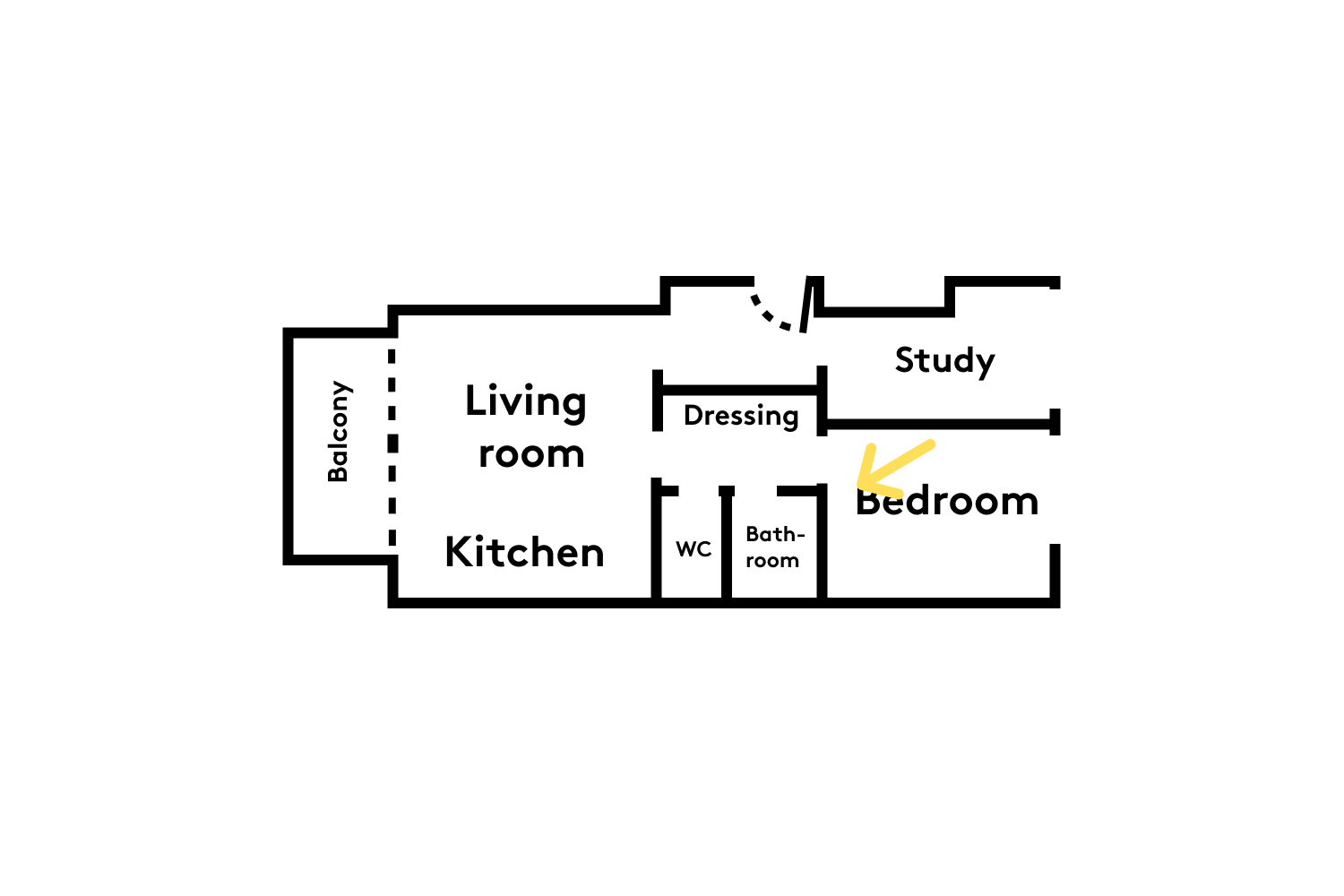 Acting not only as a pathway from the living room/kitchen to the bedroom, but also as a closet (cleverly installed on the back of the bookcase), and an access to the toilet and bathroom: this corridor has more than one string to its bow!