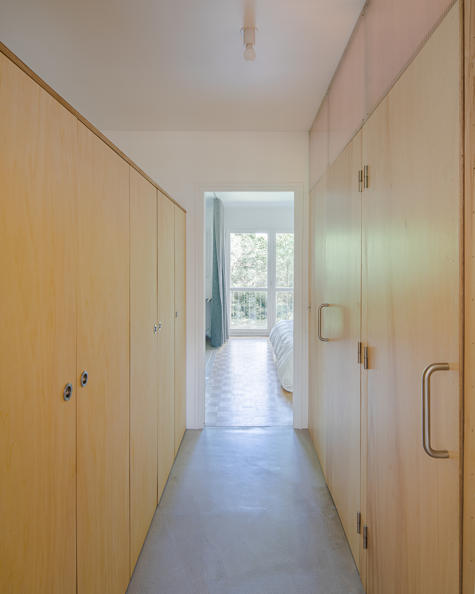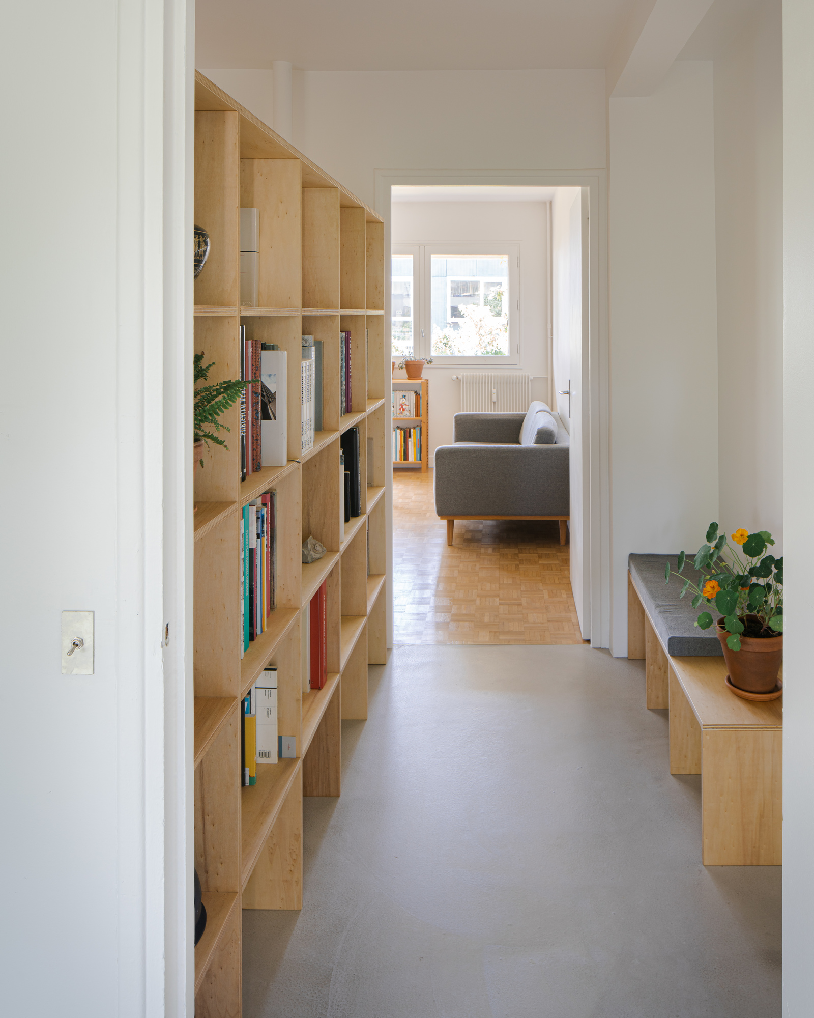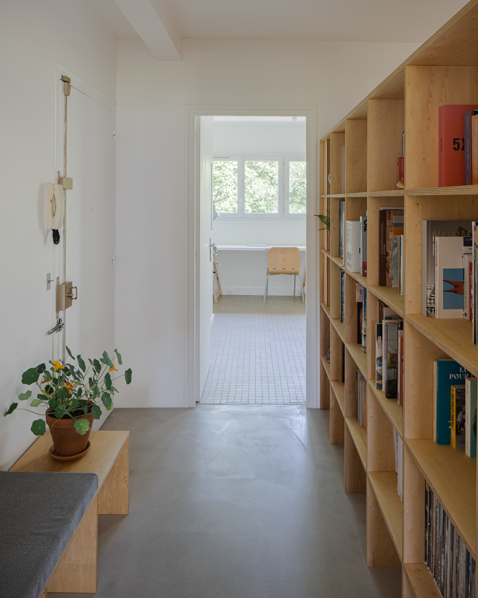 Originally leading to all the rooms in the apartment, the entrance hall is divided by a minimalist plywood bookcase set on a screed floor.