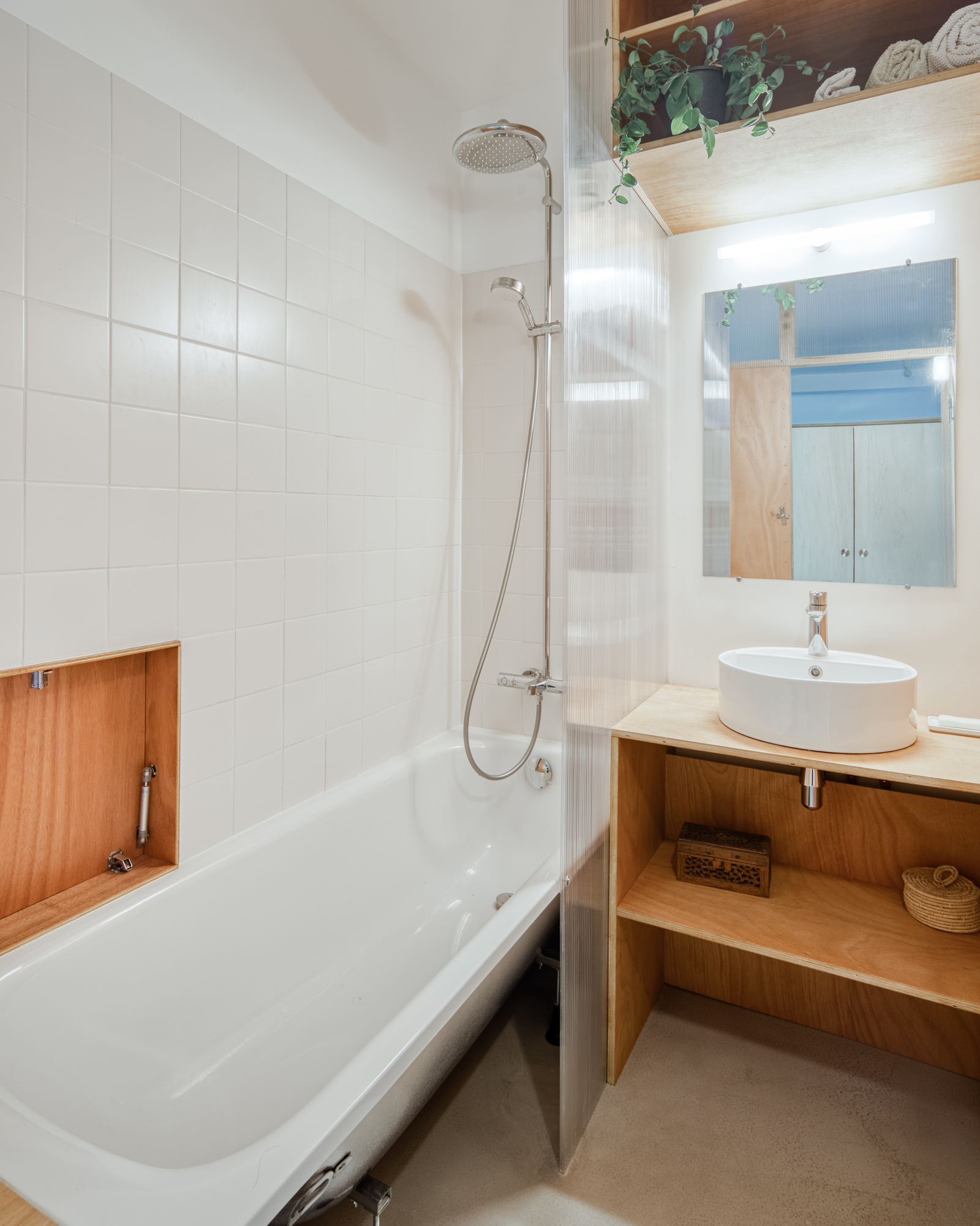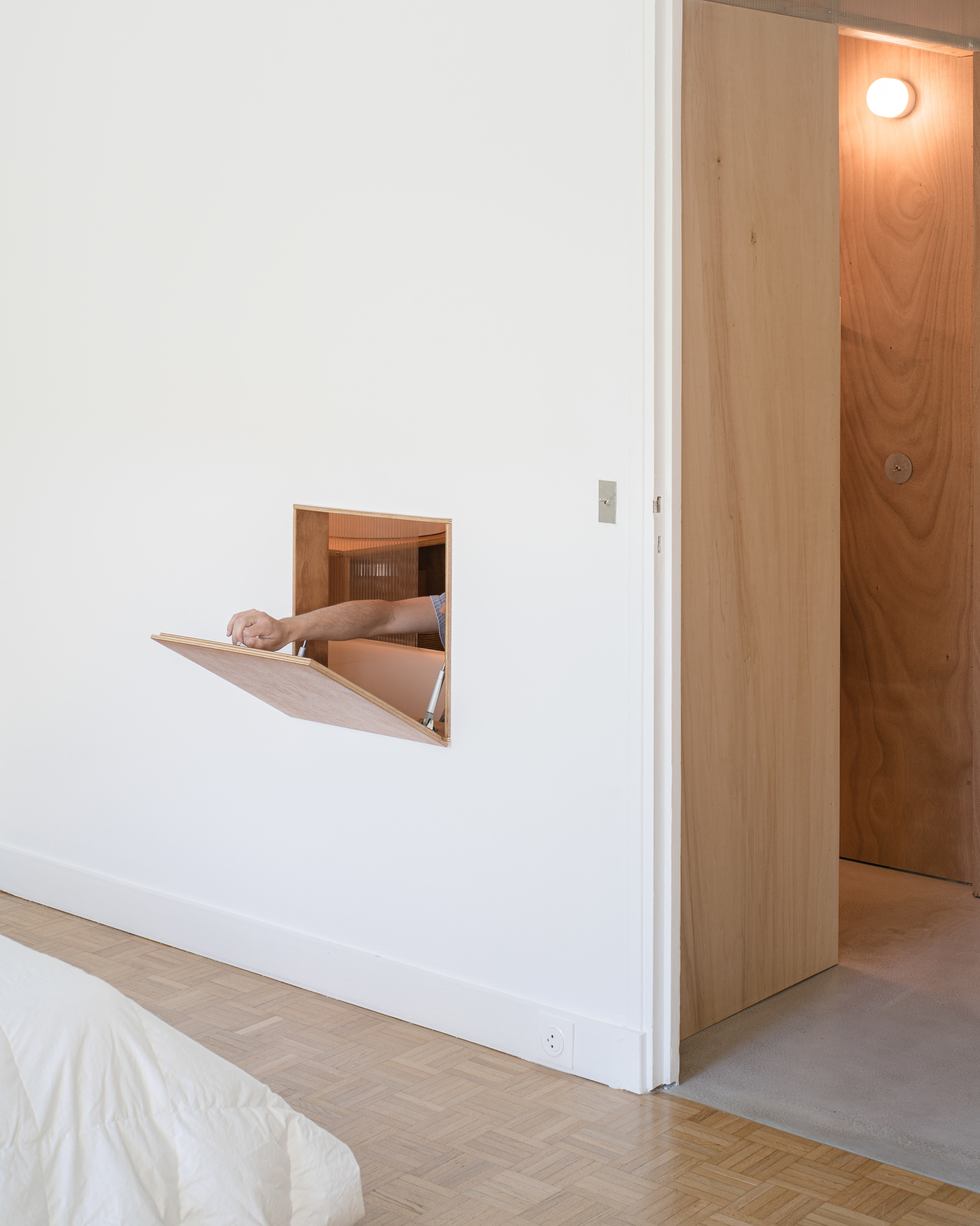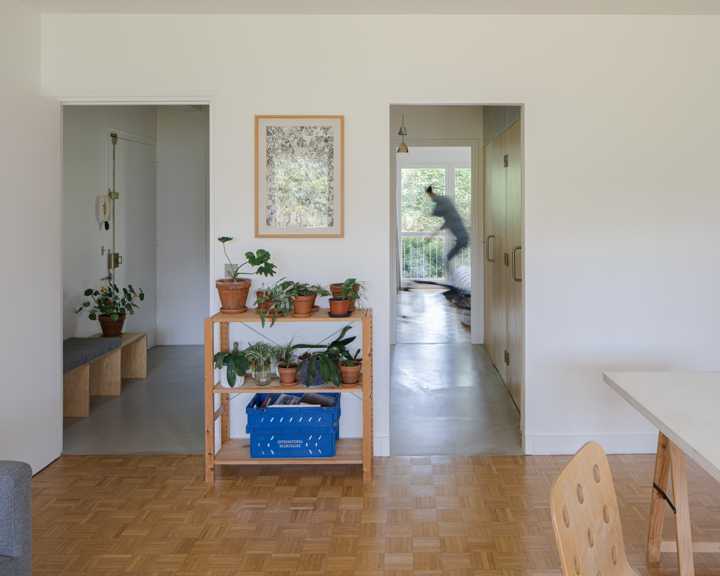 Originally leading to all the rooms in the apartment, the entrance hall is divided by a minimalist plywood bookcase set on a screed floor.
