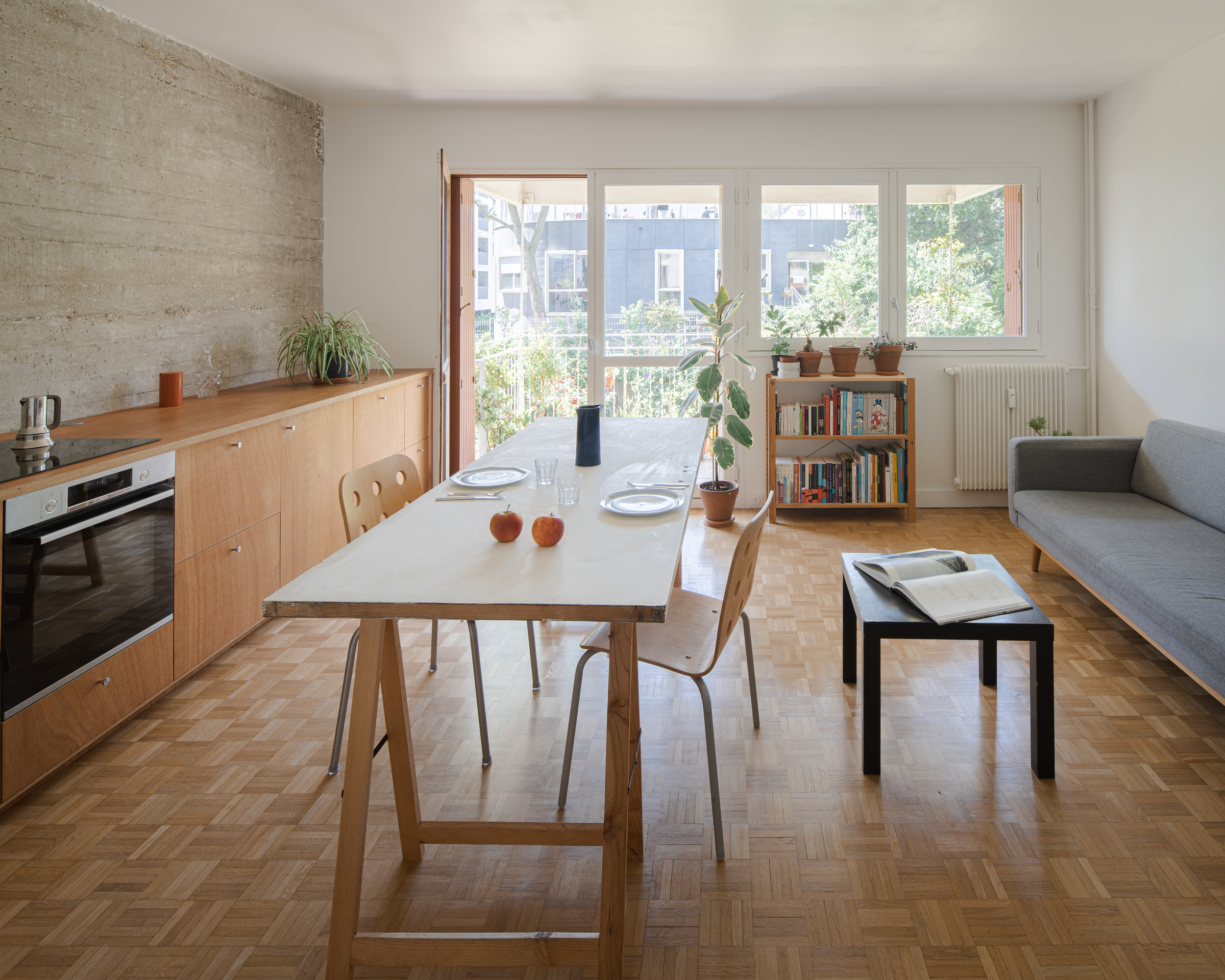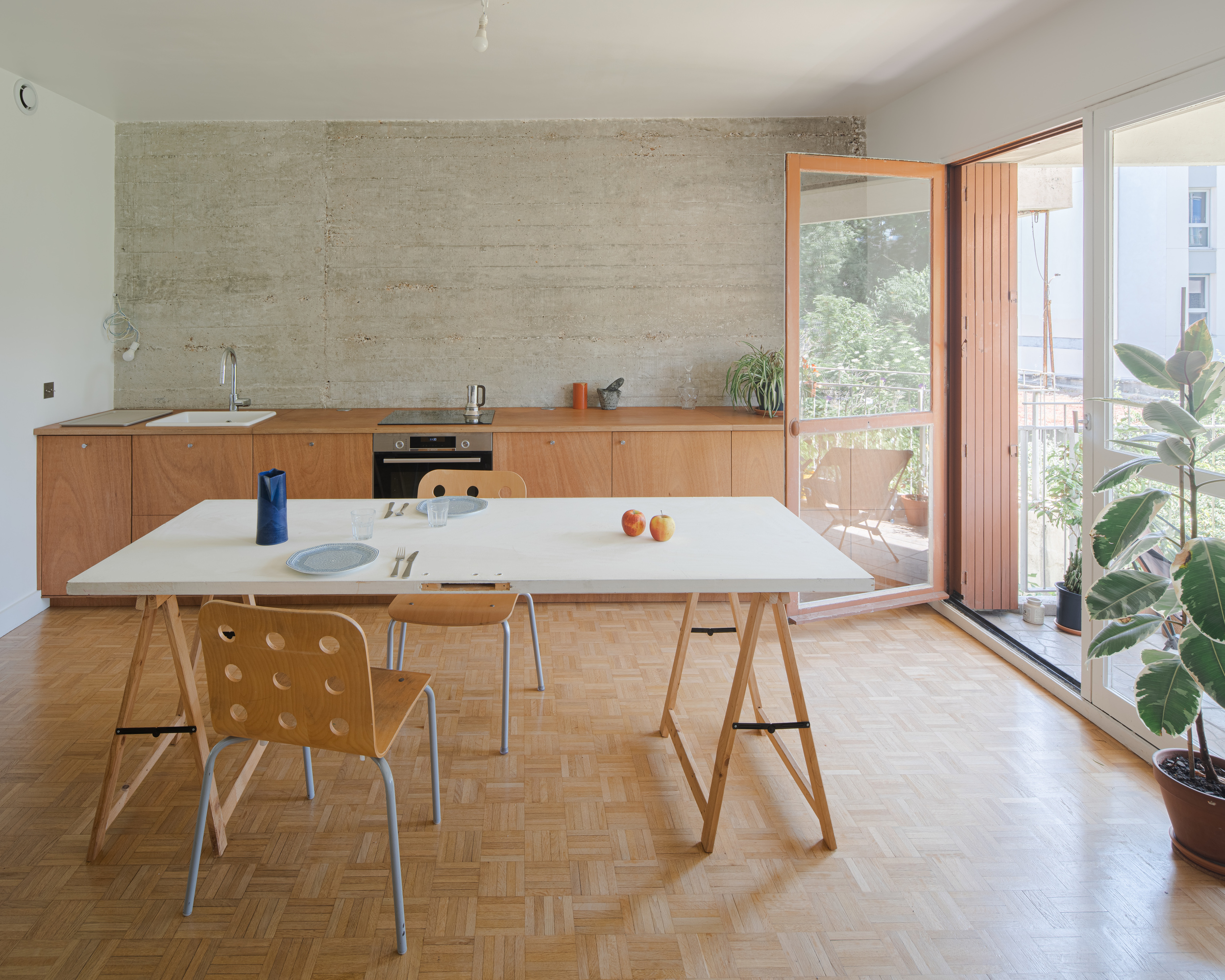 As in the entrance hall, the roughness of concrete is combined with more natural wood elements: custom kitchen furniture, mosaic parquet, chairs, trestles…