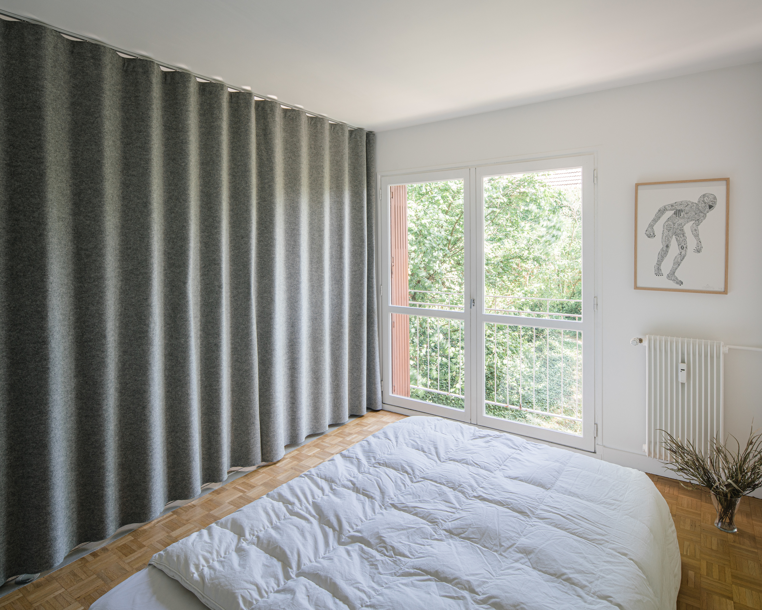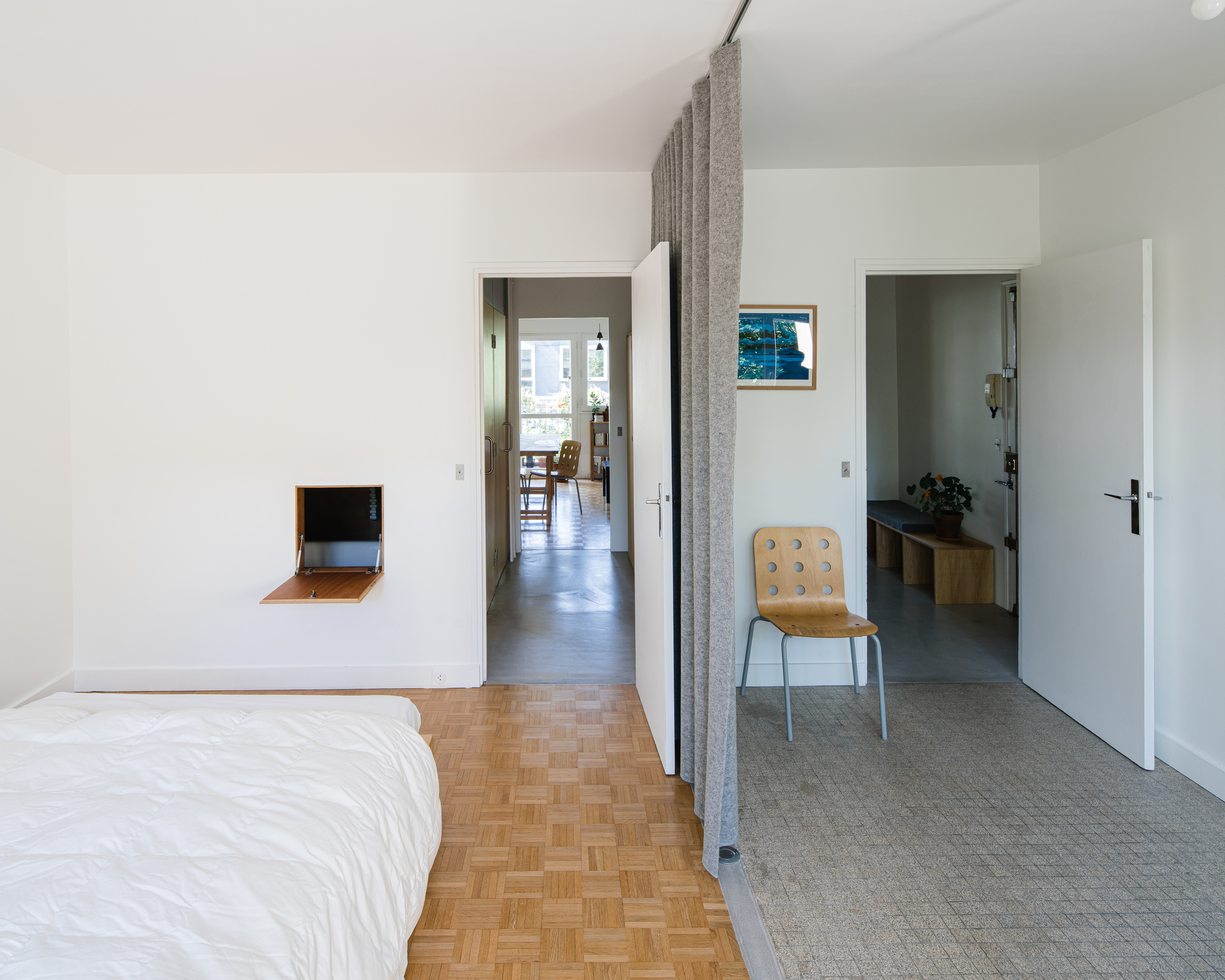 Unsurprisingly, the bedroom is also multimodal! A thick acoustic curtain isolates the room or opens it up to a workshop area, as desired.