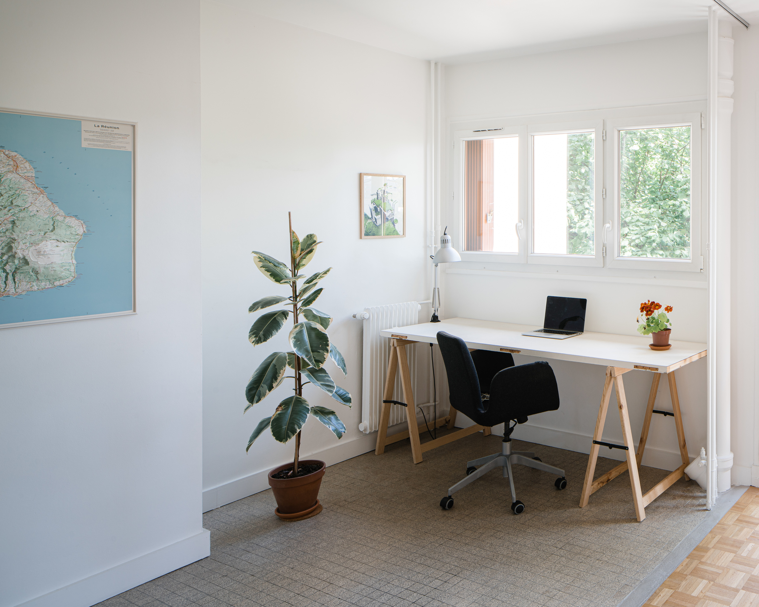 The stoneware floor, inherited from the former kitchen, marks the distinction between the workshop and sleeping areas, even when the curtain is open.