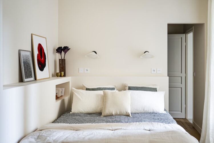 The headboard incorporates a niche for the owners’ favorite books.