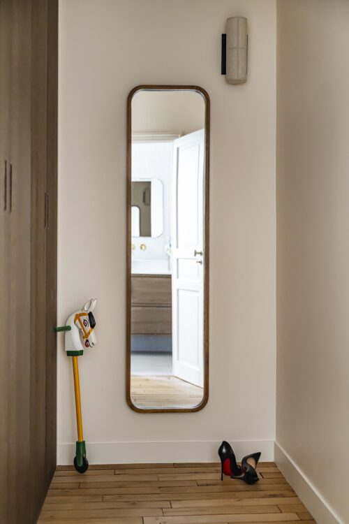 The owners wanted to improve the flow of the space and add additional rooms—a laundry room, open kitchen, and primary suite with dressing room. The long, windowless hallway that ran through the apartment was removed, freeing up valuable square footage and allowing for the creation of a large open-plan room combining the living room, dining room, and kitchen. Antique mirror: Les Trocanteuses.