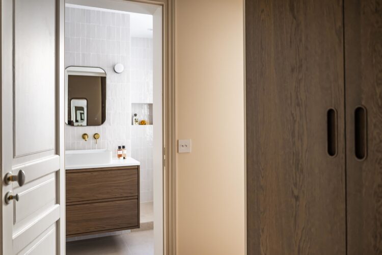 The bathroom features an elegant contrast between the light tones of the zellige tiles and the dark wood of the vanity unit. The brass fittings and custom-made shower niche combine functionality and refinement. A wall light by Zangra completes the look, providing soft, warm lighting.