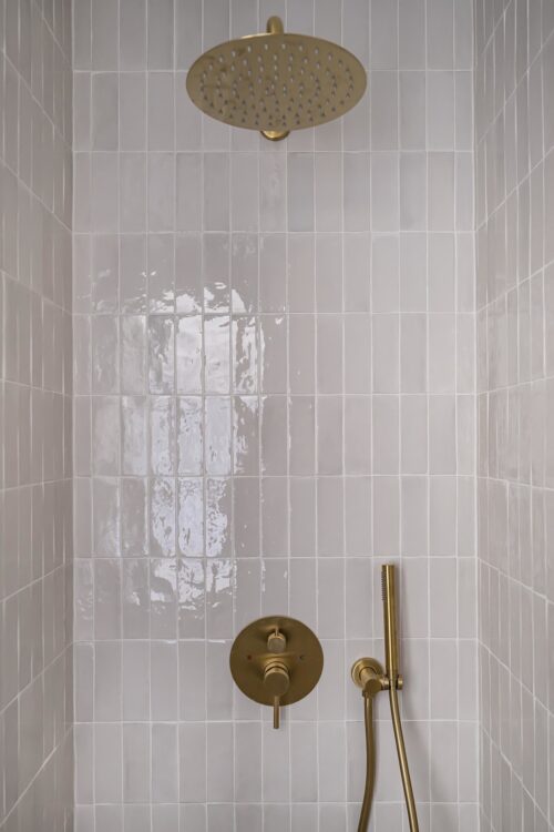 Zellige tiles cover all the walls in the bathroom, including the shower area, creating a uniform and bright look. Tiles by Les Carreaux de Paco, brass faucets by masalledebain.com.