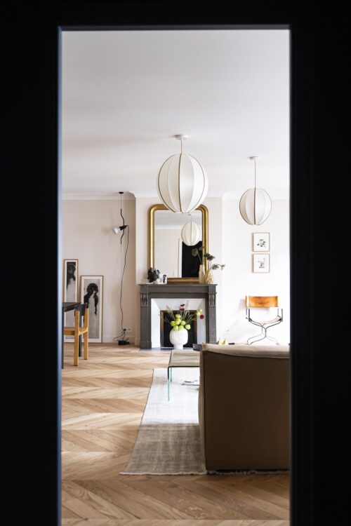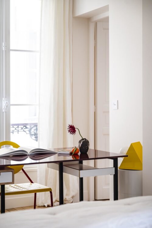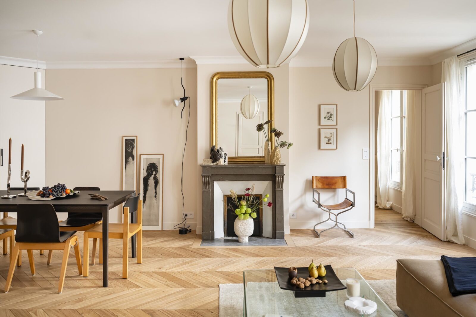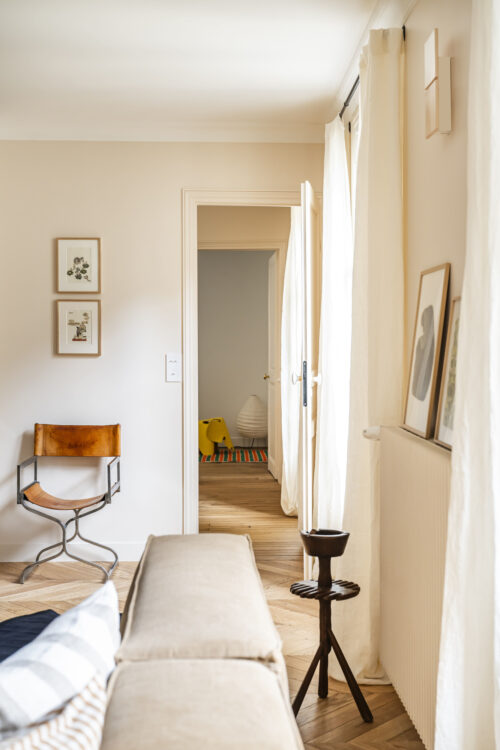 Mathilde Jourdes and Ines Venière orchestrated the selection of furniture, contributing to the apartment’s timeless atmosphere. The beige walls, punctuated with touches of black and different types of wood, bring warmth and depth to the spaces. The Ethnicraft table and Cartel de Belleville chairs fit harmoniously into this understated, elegant setting.