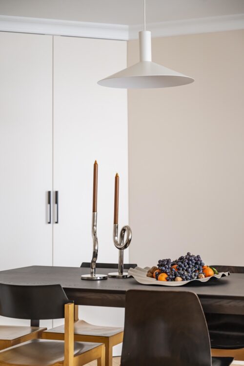 The Pierre de Plan countertop extends into the living room to form a bar, perfect for breakfast or simply socializing. The simplicity of the design is enhanced by discreet pendant lights by Serax, which punctuate the space without weighing down the composition. Muuto designer stools.