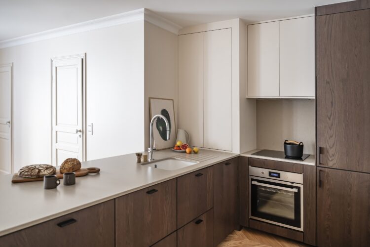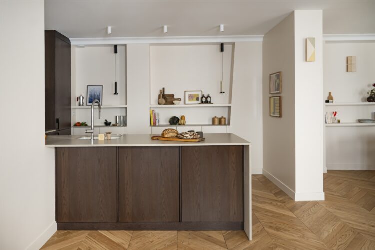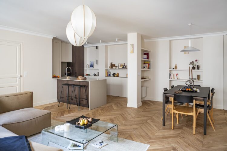 The kitchen opens widely onto the living room. Numerous built-in cabinets provide plenty of open shelving, closed cupboards, and large niches. The trapezoidal shape of one of them echoes the Violaine d’Harcourt wall lights. The contrast between dark wood and beige surfaces adds warmth and character, while the magnificent Carresol Éditions herringbone parquet flooring completes the look with elegance.