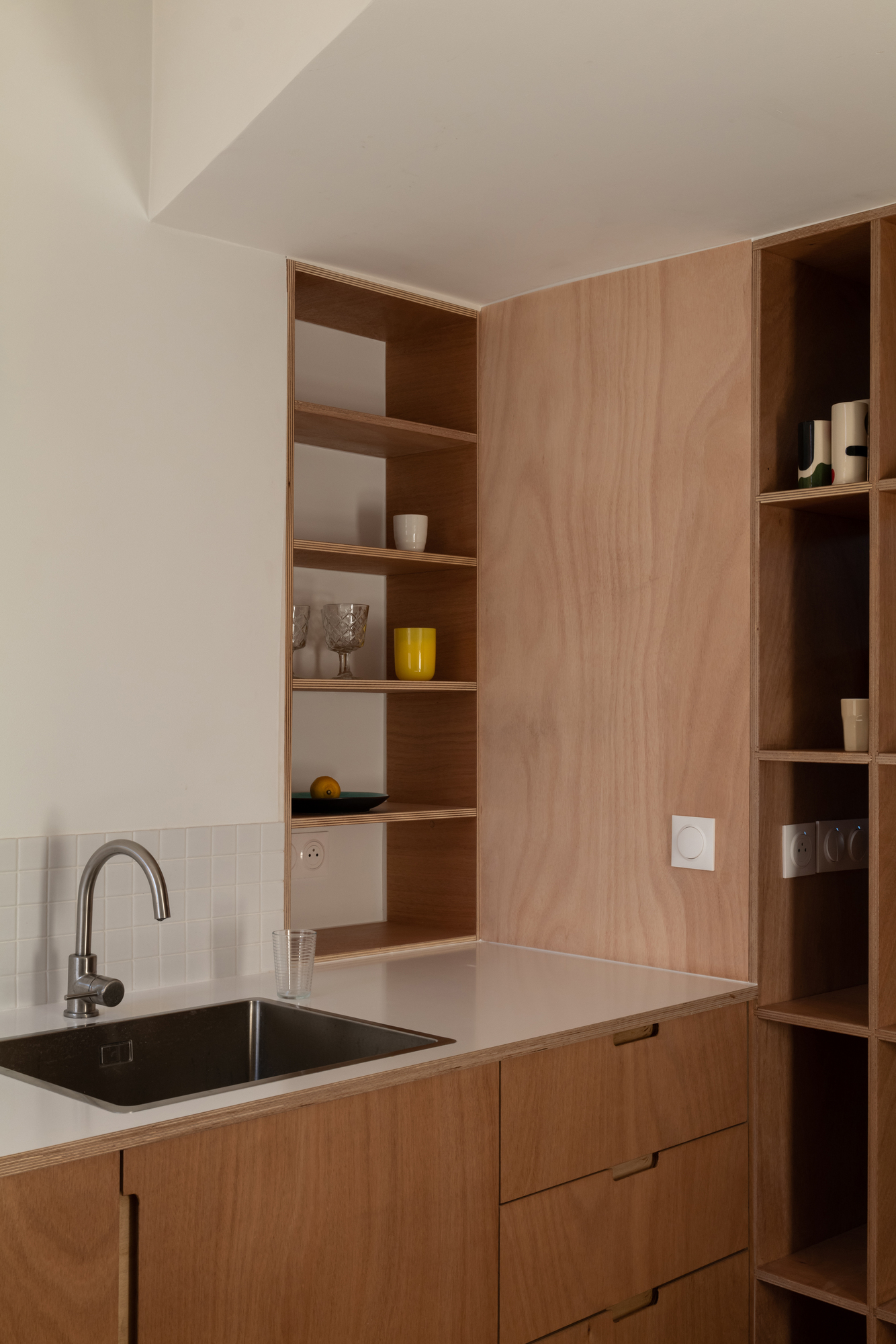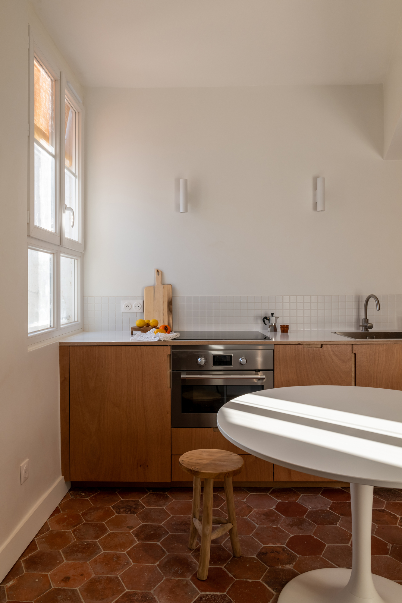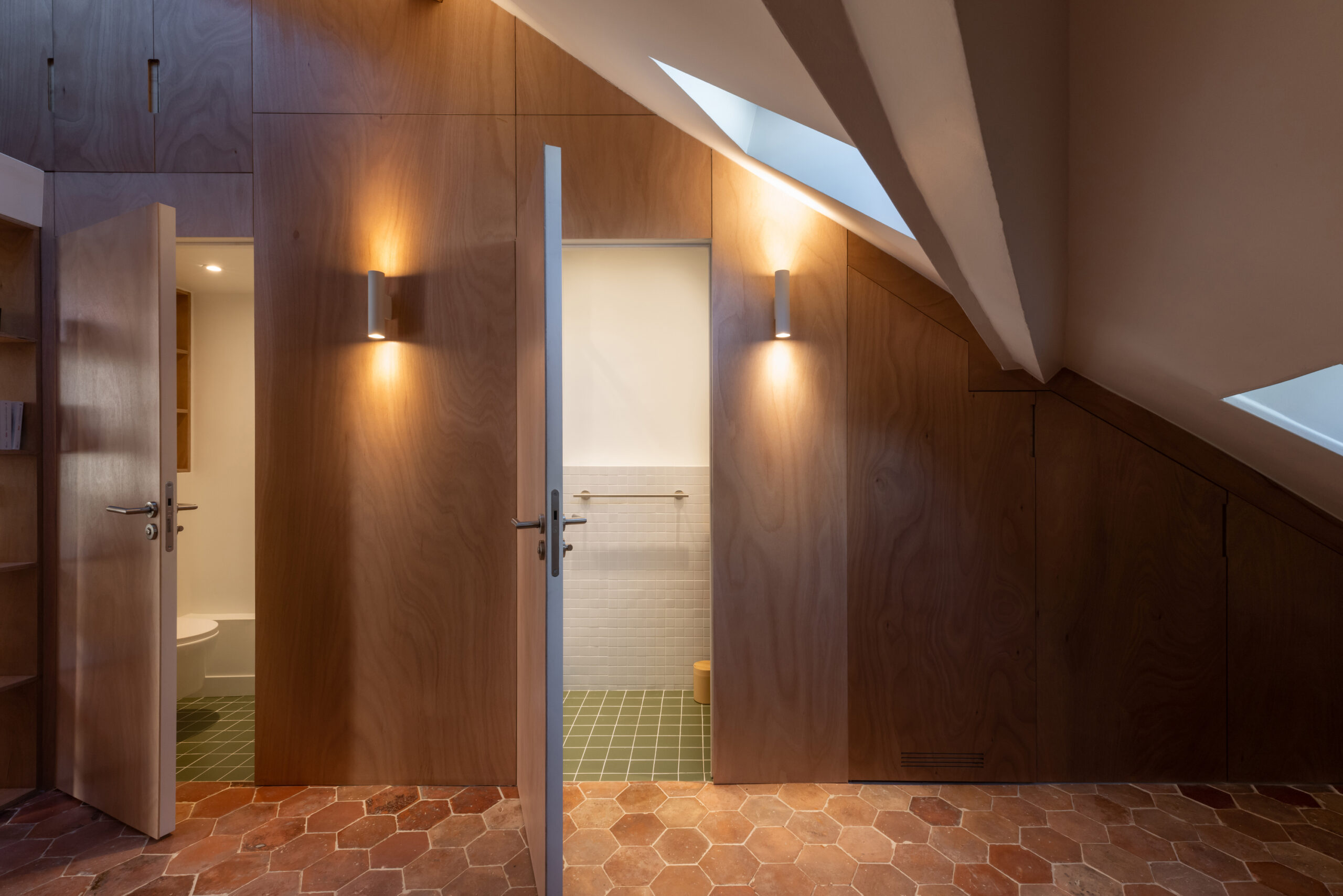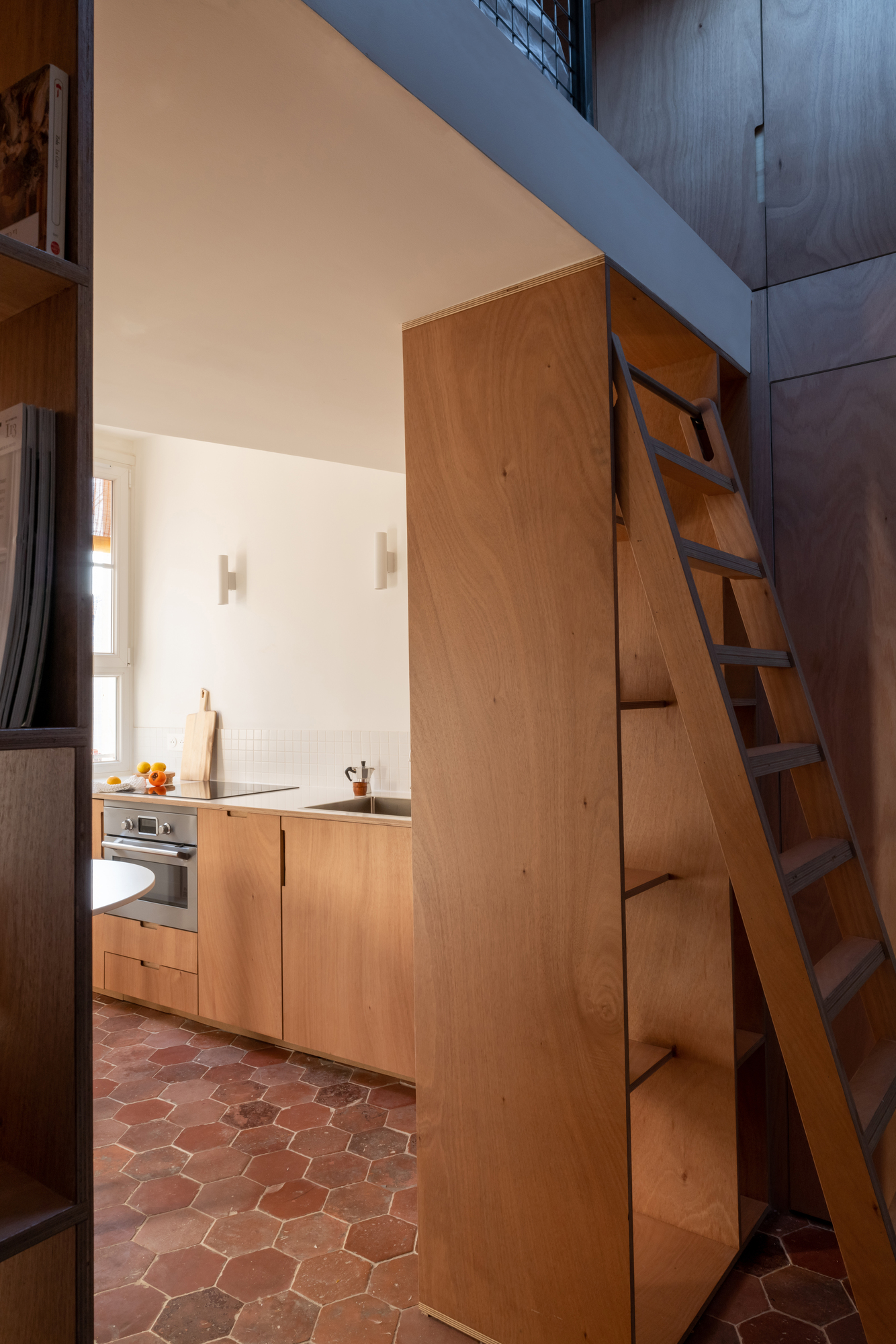 All wooden elements were made to measure in varnished okoumé plywood. The existing terracotta floor was carefully restored and updated.