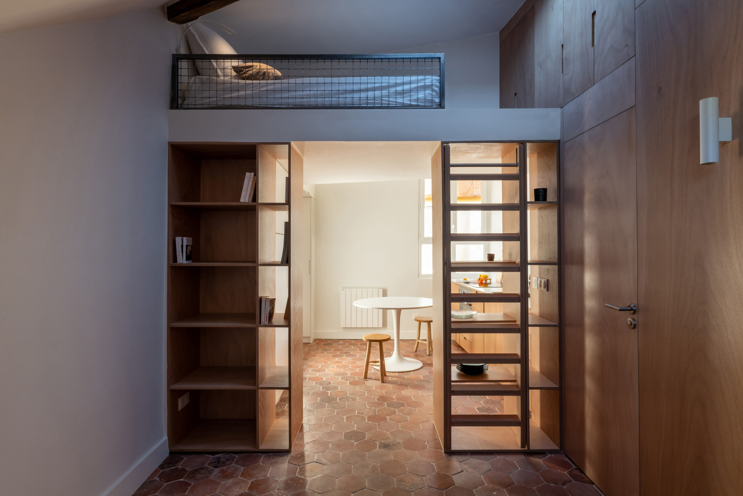 Taking advantage of the higher ceilings in the kitchen area, Joséphine Larere installed the bedroom under the roof. A metal railing guarantees the safety of the sleepers! On the lower floor, the staircase bookcase echo’s with a second bookshelf.