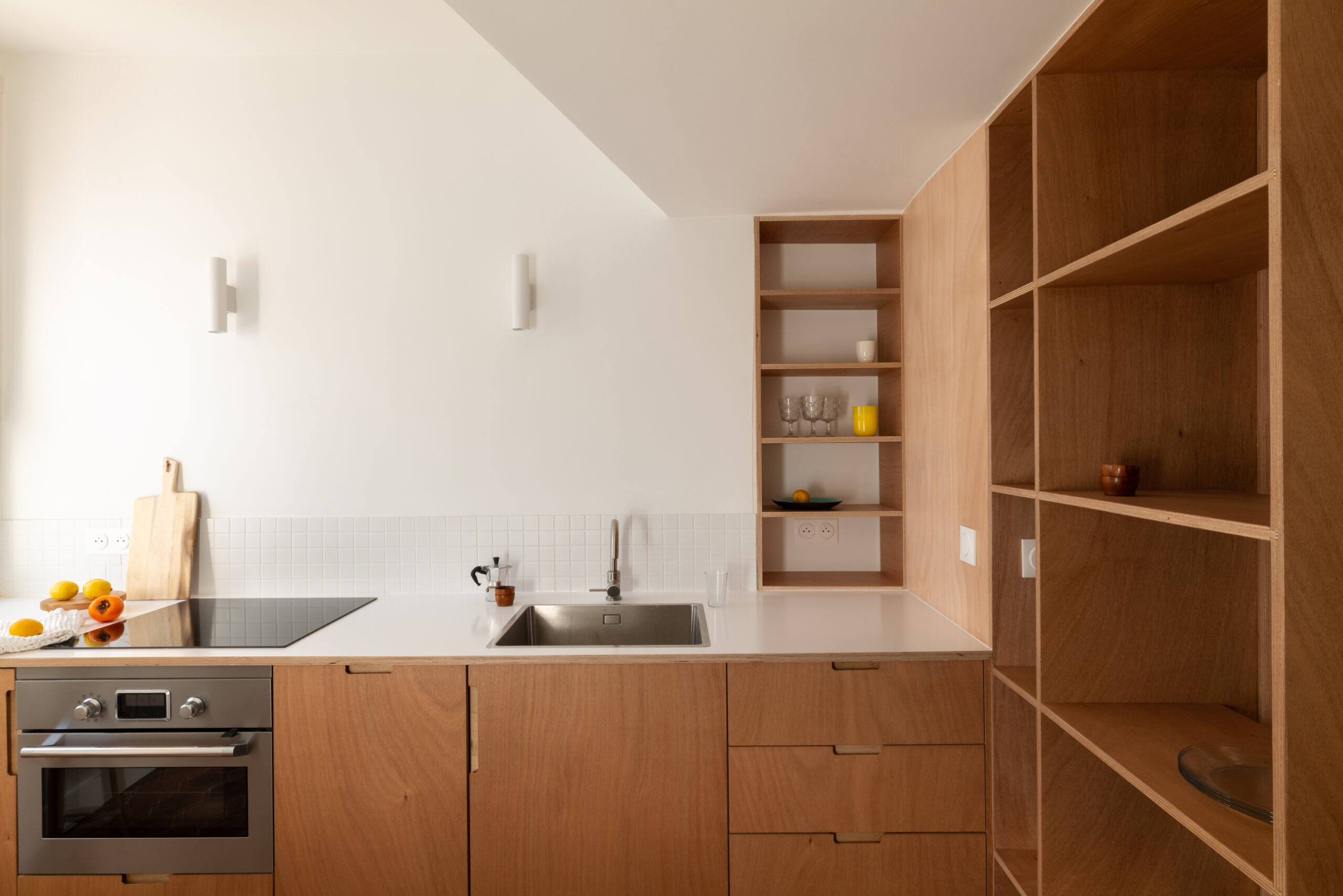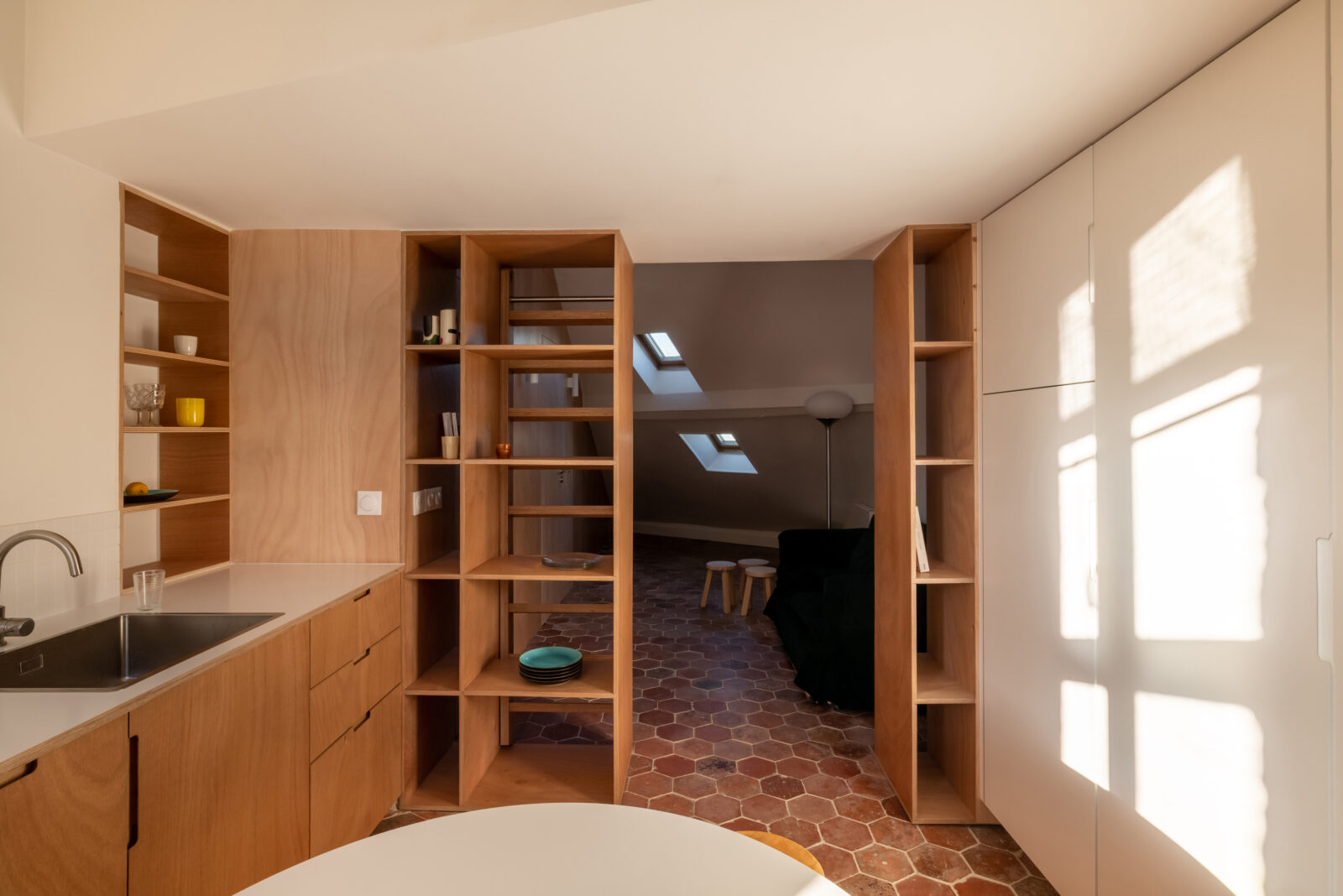 Joséphine Larère was entrusted with the renovation of this under-roof studio in the 14th arrondissement of Paris, and completely redesigned the layout. Her aim was to increase the apartment’s surface area by removing as much clutter as possible, and to bring light into every corner.