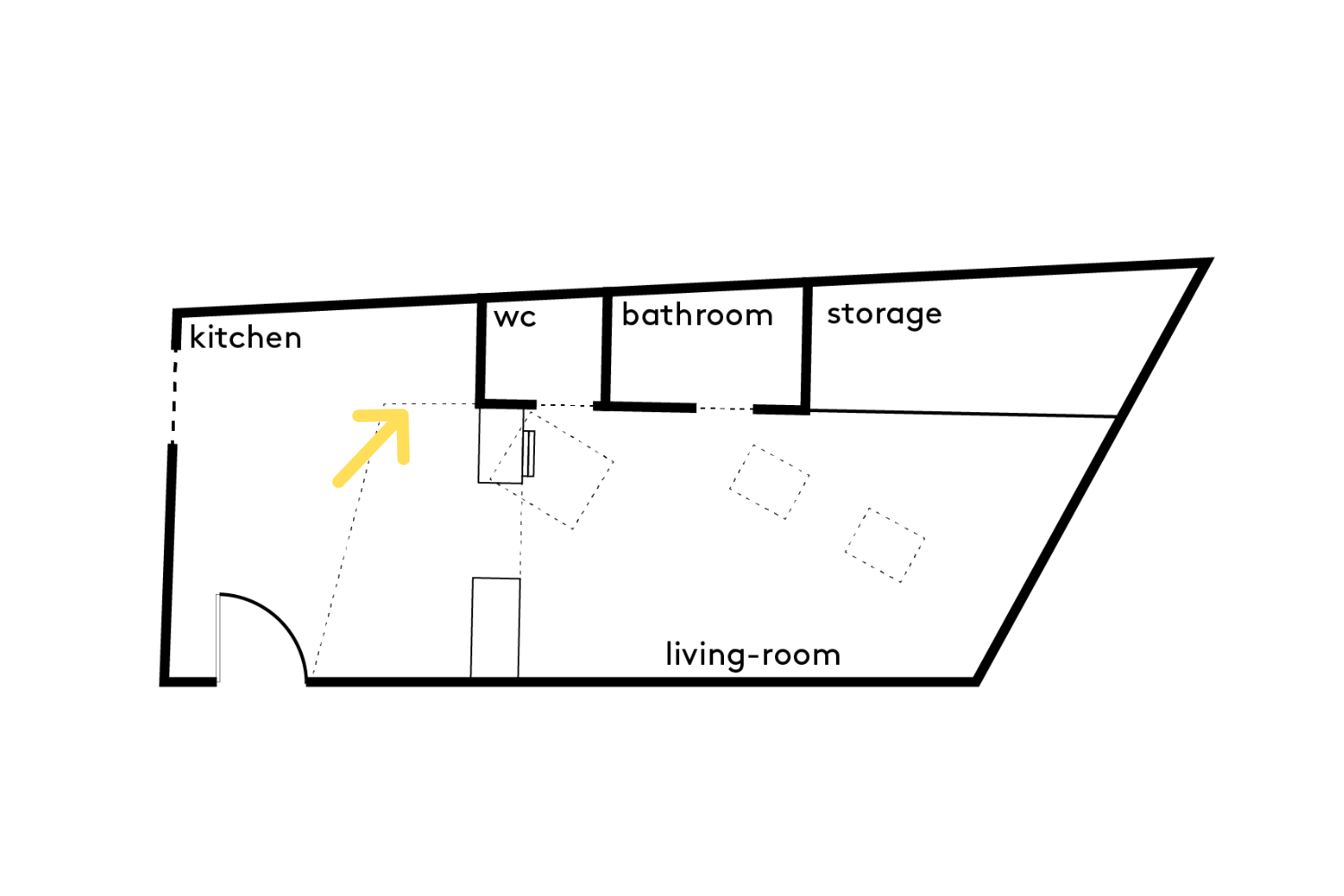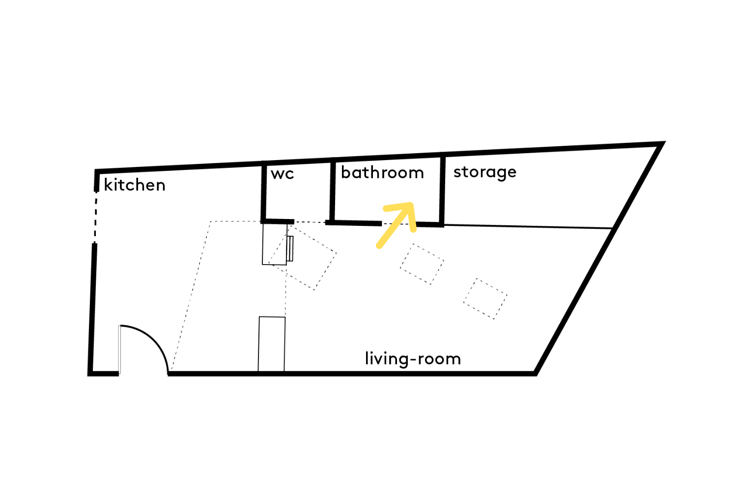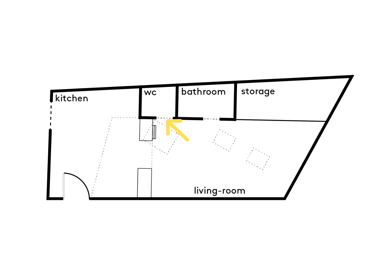 To echo the wooden bookcase that separates the kitchen from the rest of the studio, a wooden shelf has been placed above the toilet.