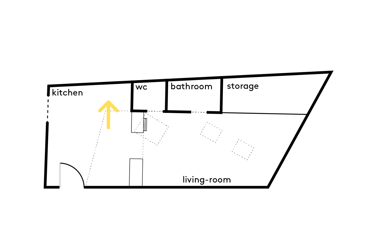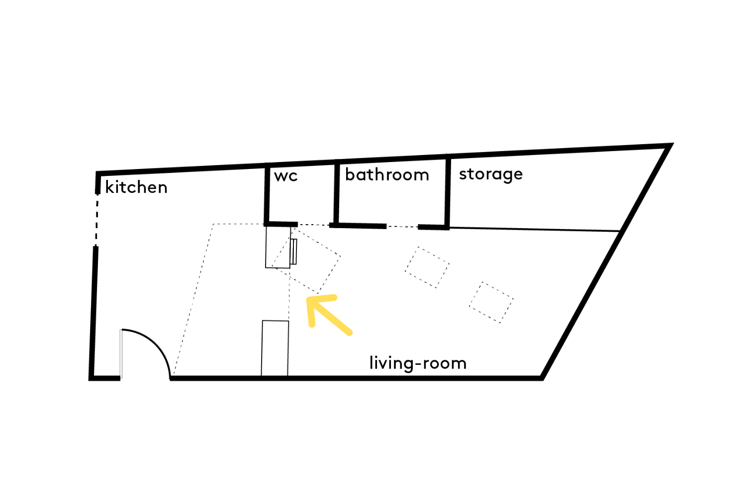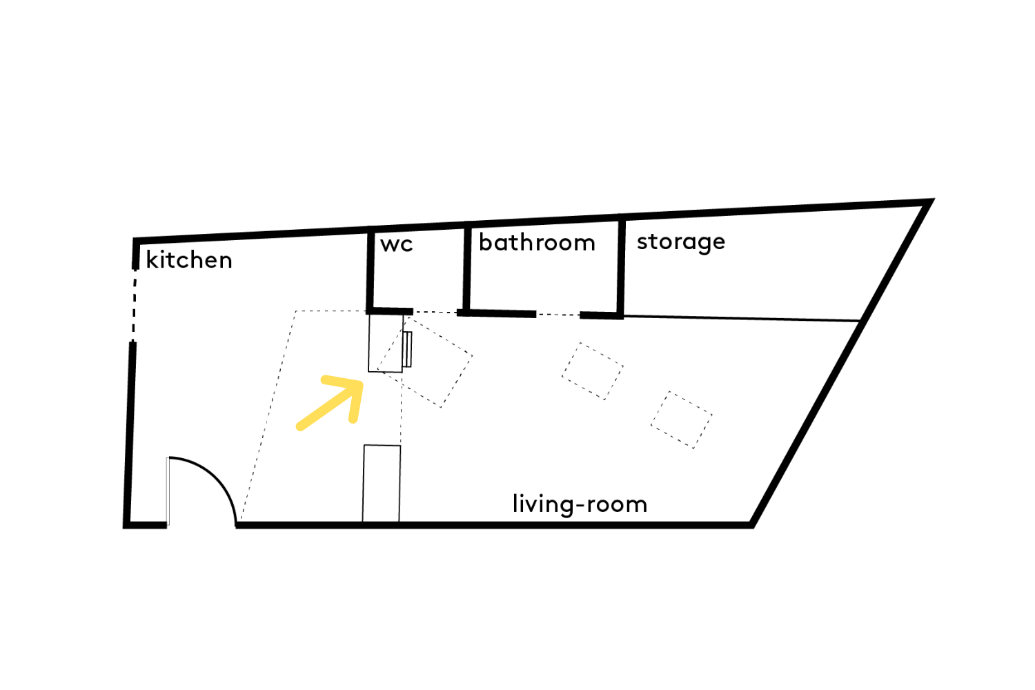 To echo the wooden bookcase that separates the kitchen from the rest of the studio, a wooden shelf has been placed above the toilet.
