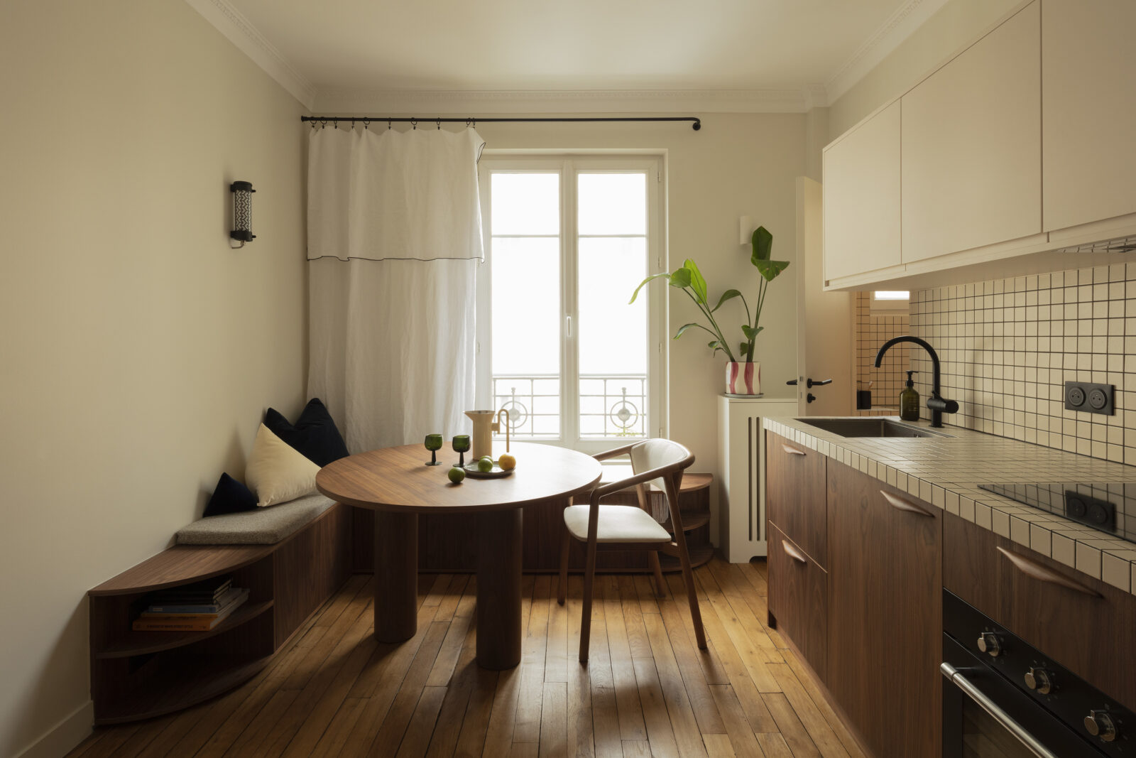 The studio had not been updated for a few decades, of course, as evidenced by the wall-to-wall carpeting. But it had good bones, great exposure, and a separate kitchen that could easily make way for a bedroom. But wait – a one-bedroom apartment in just 24 square meters? Raphaël promised his friend to optimize the space and storage as much as possible, in accordance with his wish to have the space for all of his passions: fitness, music, cooking, video production – and intense poker games: “This apartment should not only be a place to eat and sleep, it should be a complete living space.”