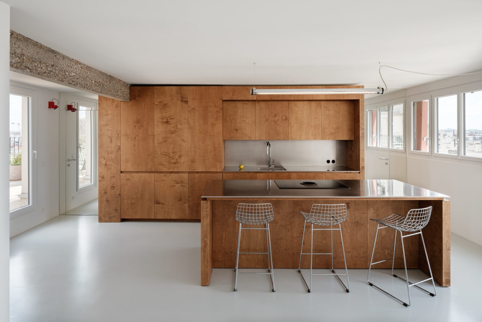 For the past two years, the couple have divided their lives between Barcelona and their "little Parisian penthouse", as they like to call it. They get the best experience of this large condominium: frequent aperitifs between residents and a lovely neighbor who takes care of the apartment in their absence. Alain confides that he's thinking of enlarging the opening onto the terrace at a later date. So there's more history to come!