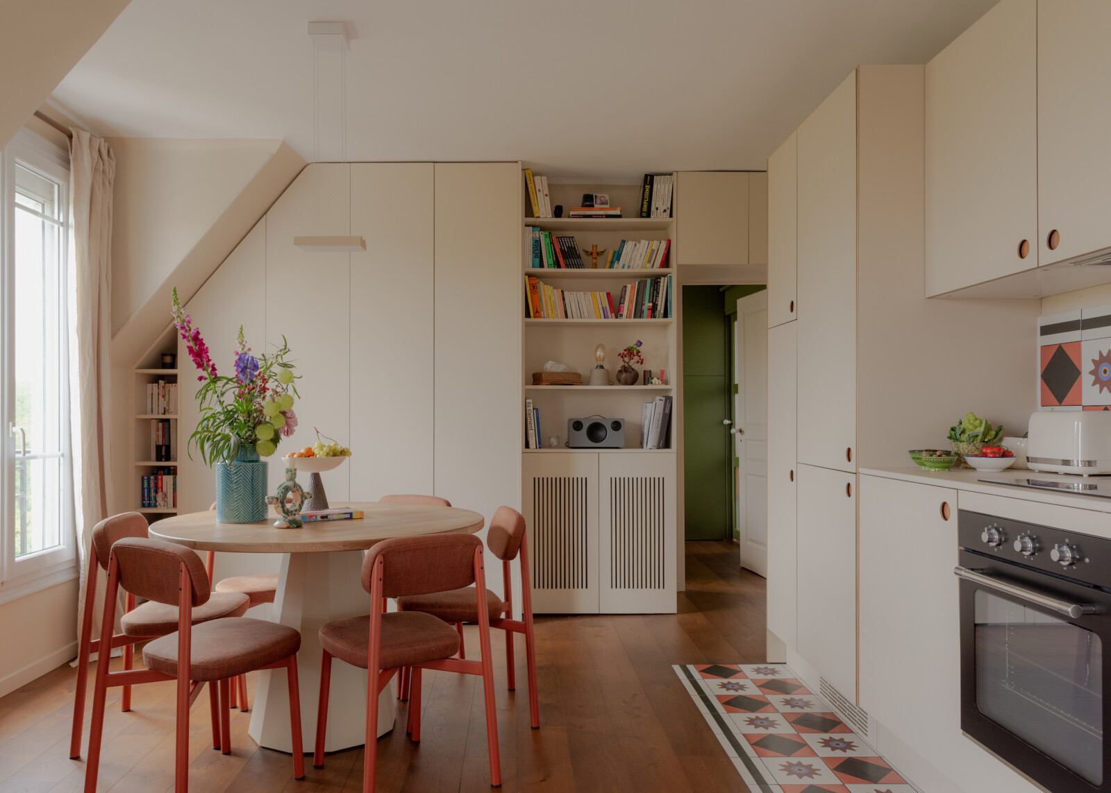 Nestled on the top floor of a nine-storey building adjacent to the iconic Buttes-Chaumont park, it was love at first sight between this apartment and interior designer Michel Ward, founder of Studio Trame, and his partner. For this purchase, the couple were looking for a bright, spacious property close to