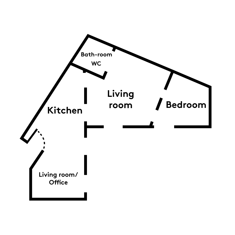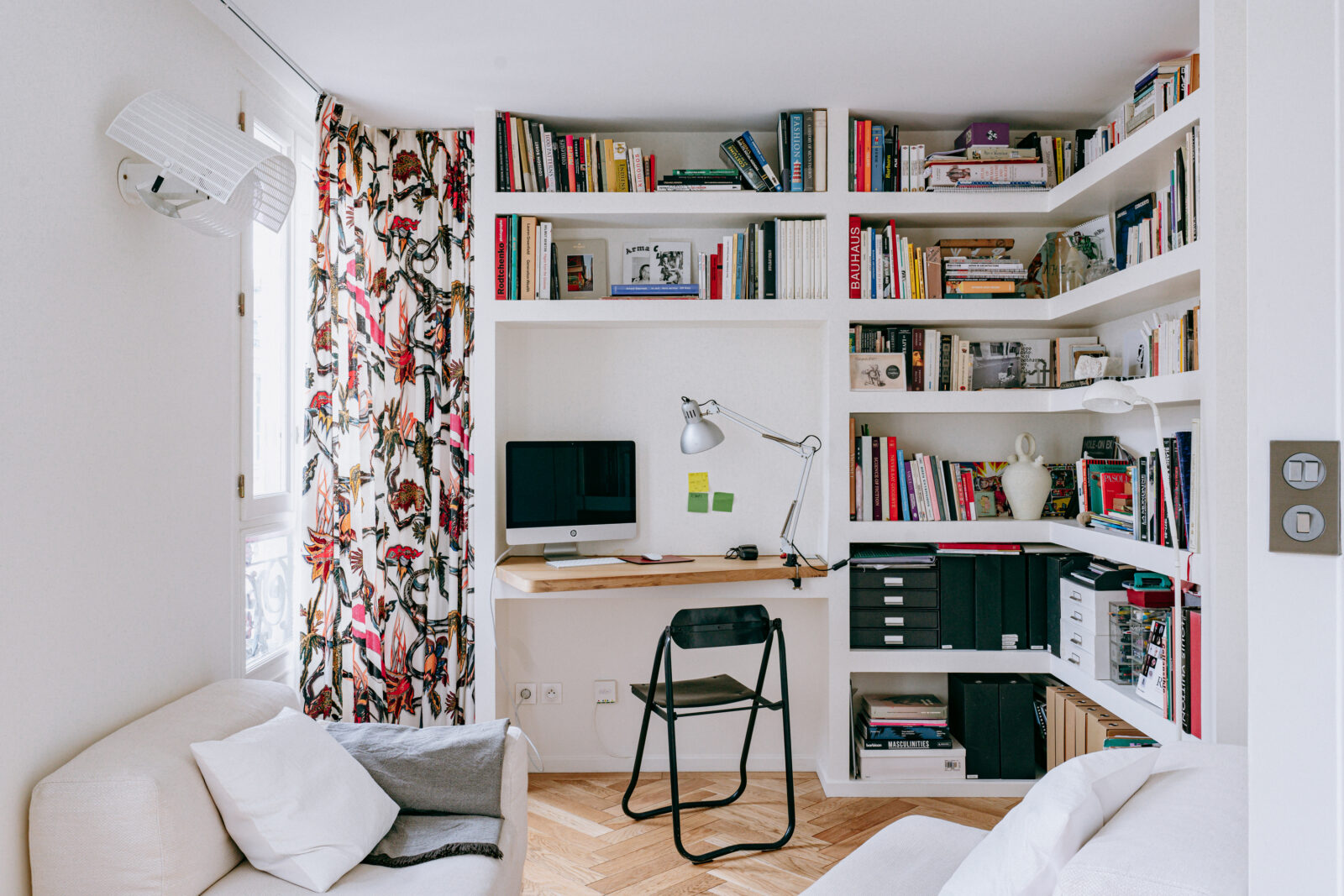 The vast kitchen was turned into a creative space. A bookcase lines the walls with an embedded cantilever desk inspired by the one designed in 1939 by Charlotte Perriand: "I didn’t want a desk leg to get in the way,"explains Ana. The thick oak plank’s protruding angle recalls the apartment’s own off-kilter floor plan. The kitchen finds itself facing the front door, in an acute angle opening up on the living room. The bathroom is nestled in a corner and illuminated by a skylight above the shower. The bedroom hasn’t moved, but was shrunken to give way for the living area. "Now I feel like the apartment is bigger than it really is. And that’s all thanks to my architects – I mean, my parents!"