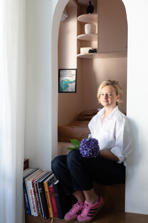 With a hydrangea in her hands, Camille Saucereau warmly welcomes us to her Parisian apartment.