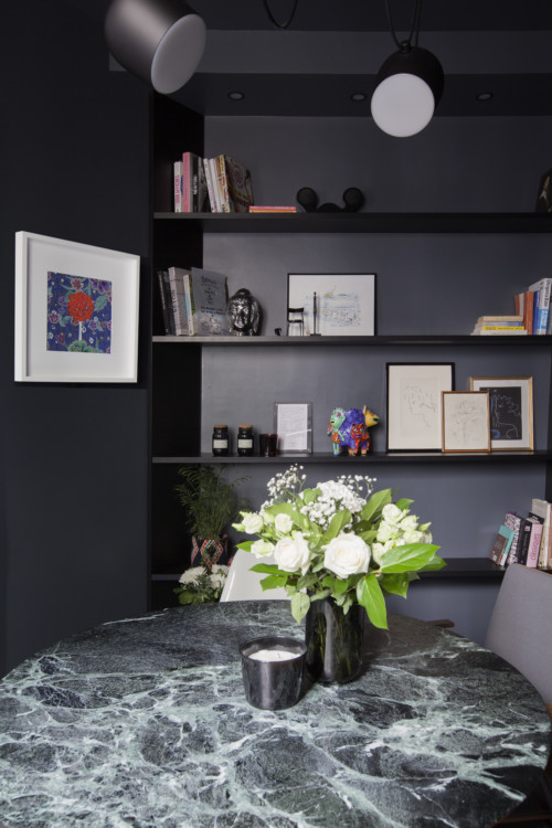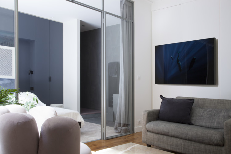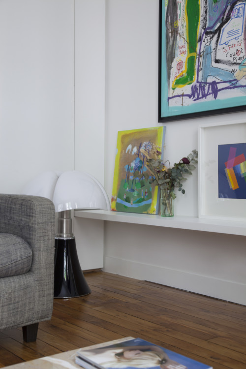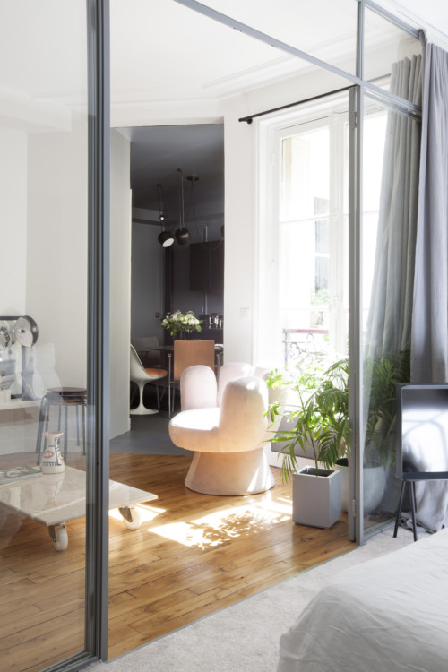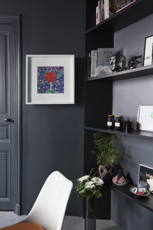Here we discover many bold choices that are the architect's hallmark: the very dark, almost black paint in the kitchen, the bathroom completely open to the bedroom and the pink carpet. But this apartment is also packed with details that are both practical and aesthetically pleasing. Not least the living room's large low shelving unit, used to display numerous works of art. The result is a highly contemporary ambience that blends surprisingly well with the original Haussmannian style.