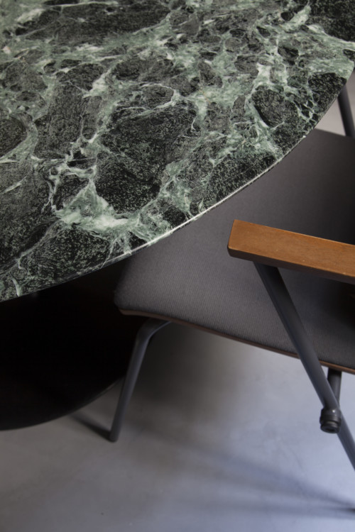 Meals are served on a Knoll marble table, lit by the AIM suspension by the Bourllec brothers. Bouroullec brothers. The chairs are also by Knoll, but have been reupholstered and refurbished.