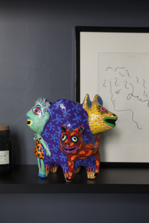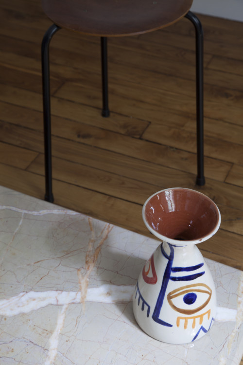 The low shelf is particularly popular! From left to right, an acrylic on rice paper by Nicolas Dubreuillethe photograph Soweto from the sky by Thomas Hoeffgen and the sculpture Moonshine by Haude Bernabé.