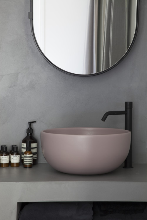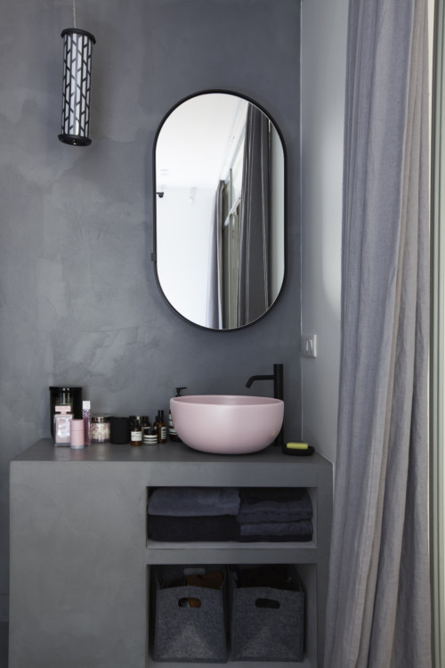 A bold choice of hues with the gray set and dark pink basin. Mirror and basin by Ceramica Cielo and suspension by Sammode.
