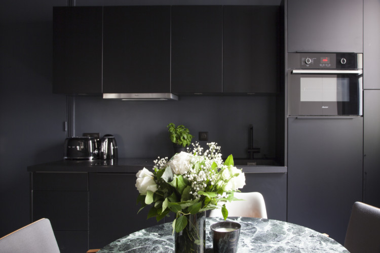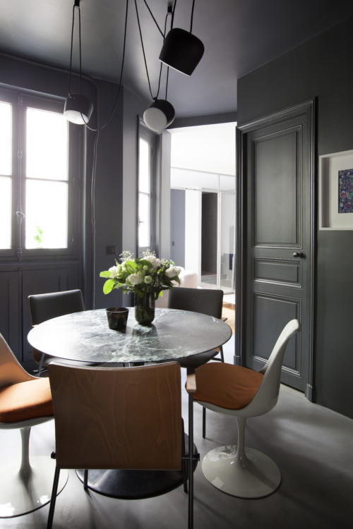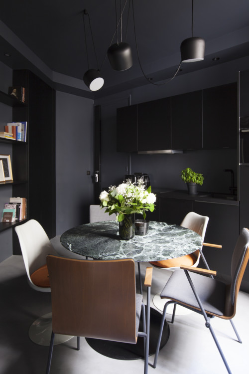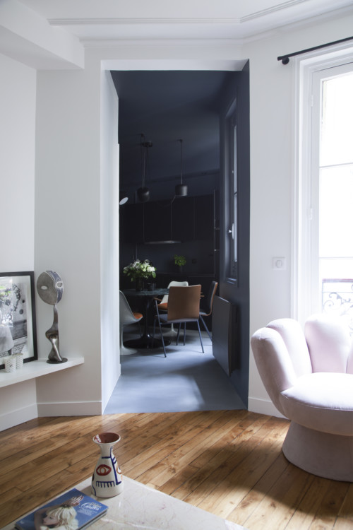 The view towards the kitchen in black modules from ARIVAT. This space was by nature very dark. Rather than make it an intractable problem, Camille Fernez integrated it 100% and played it to the hilt. As a result, it appears very luminous. That’s the art of contrast.