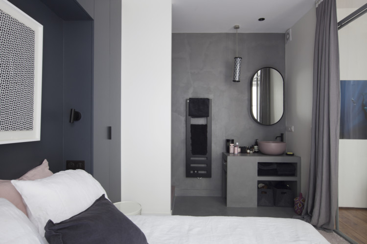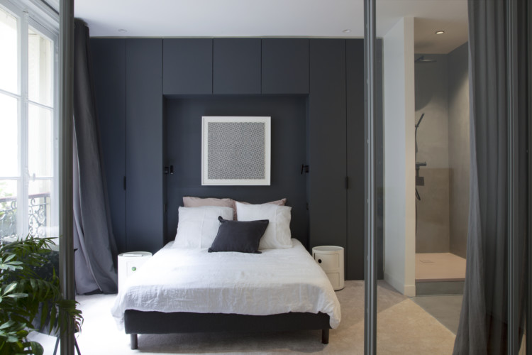 The view into the bedroom with the large closet – headboard designed by Camille Fernez. Above the bed, a silkscreen by figurative artist François Morellet. To the right, the shower, with pink carpet on the floor.