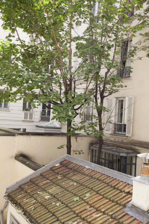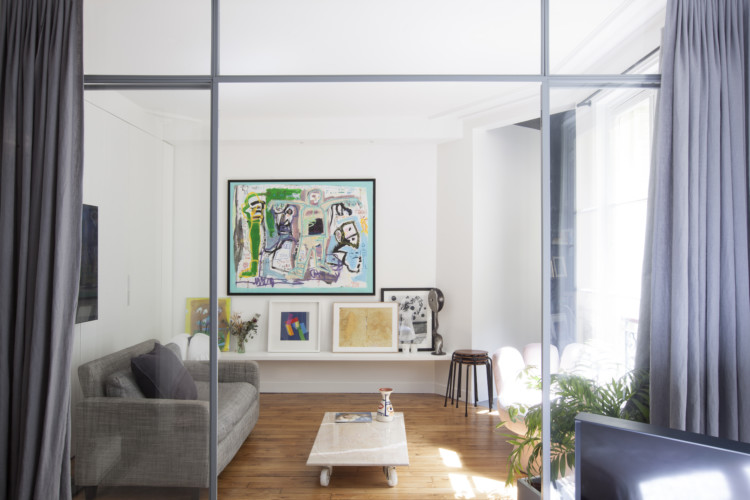 The client loves art and will be living alone. These two pieces of information formed Camille's specifications, and it was with these in mind that she designed the apartment. The apartment was completely restructured, decompartmentalized and separated into three distinct, adjoining spaces. The kitchen and dining room are located in the entrance hall. Further on, in the great room, comes the living room. From here, a large glass roof leads to the bedroom and bathroom. To retain the original Haussmann charm, the parquet flooring has been reclaimed from under the carpeting, and some of the moldings have been renovated.