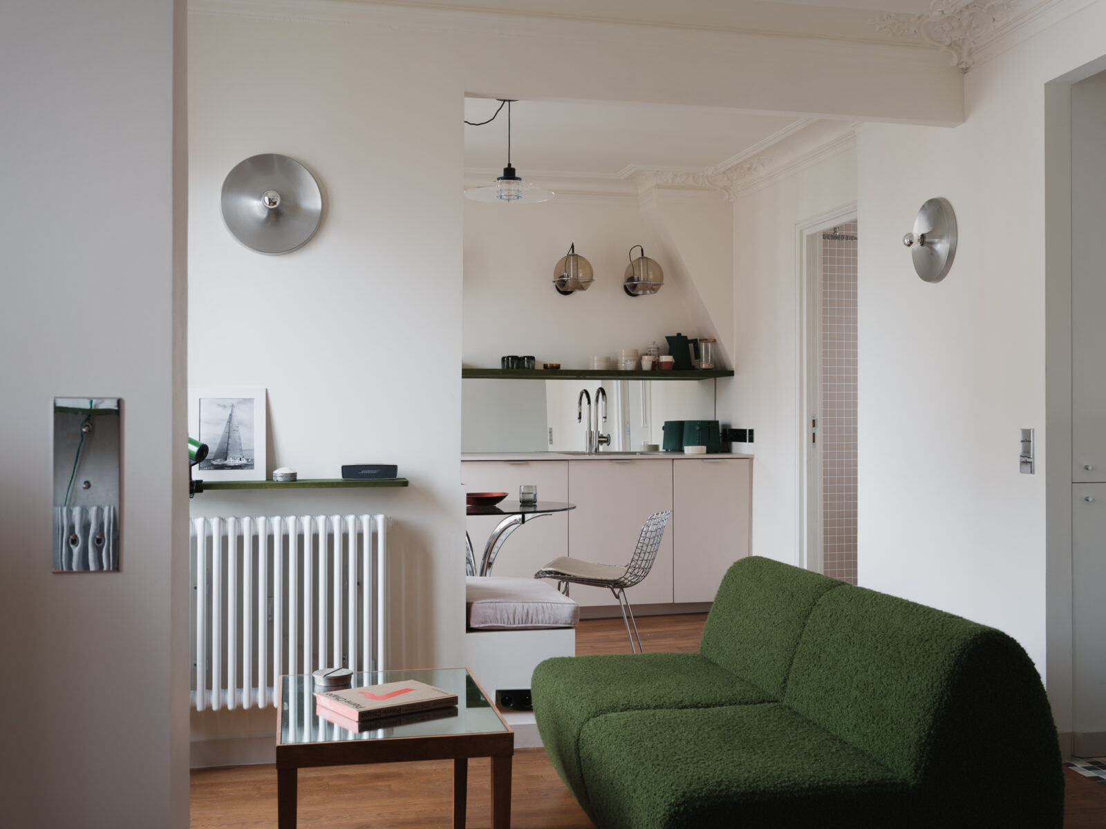 Switching the floorplan around to optimize light. When architect Malorie Rojon came across this 35 m² apartment on the top floor of a building in the 14th arrondissement of Paris, she was not just charmed by the period moldings, but above all by the three windows that faced her, unoverlooked and with an unobstructed view of the Eiffel Tower. And then she had a revelation... “Initially, we thought we'd create a master suite as an extension of the bathroom. But when we saw the light when we broke down the partitions... We decided to reverse everything! Architectural constraints were the driving force behind the project,” she explains. The whole apartment was oriented towards the windows, to guide the eye towards the Eiffel Tower. In fact, it was the openings that defined the spaces: on window in the bedroom, one in the living room and one in the kitchen! So, no matter where you are in the apartment, you'll always have an unobstructed view of a piece of the Parisian sky. After renovation, the renovated property now serves as an intergenerational family pied-à-terre for a couple, their children and grandchildren, who take turns occupying it. Malorie anticipated all possible uses to accommodate different lifestyles. For example, the bedroom can be transformed into an office during the day, and accommodate a baby bed at night. The space, left deliberately open-plan, also called for a harmonization of colors to bring coherence. A palette of greens and pinks is used in the living rooms, bedroom and bathroom. All of which is enhanced by a selection of vintage furniture and lighting, creating an elegant little Parisian setting.