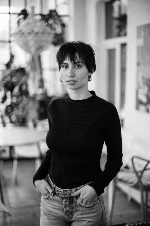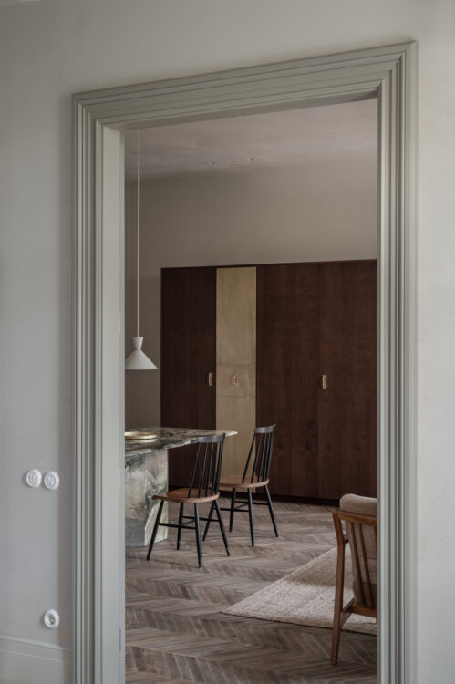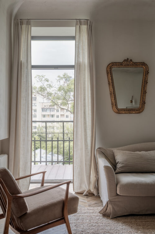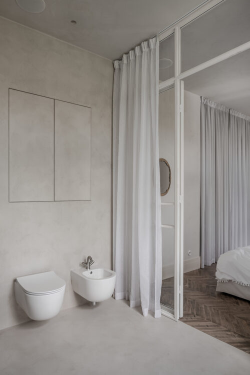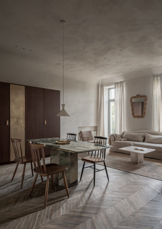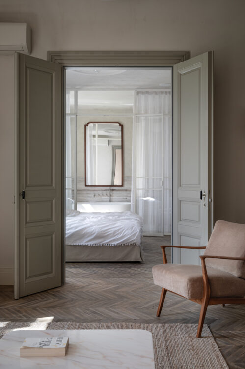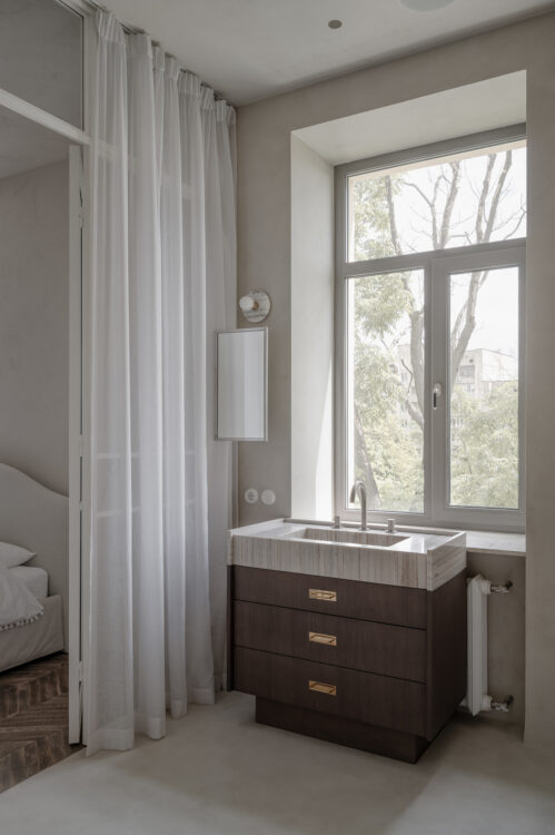Ukrainian architect Rina Lovko was commissioned to work on the project, and quickly realized that the building’s structure was in a very poor state. “The slabs were rotten, the walls cracked and the flooring had to be replaced. The wooden partitions, meanwhile, had suffered from damp and the presence of parasites.” The original partitions and parquet flooring were therefore dismantled, the balcony and walls reinforced, and the floor consolidated with a poured concrete structure. Completely stripped bare, the apartment can now be dressed… but not just any old way! Parisian style: for the owner, nothing is more “chic” than a Parisian interior. “Entirely focused on aesthetics, this project was designed to meet the beauty criteria of our client, who is fascinated by the City of Light. Our aim was to recreate the ambience of a Haussmann apartment, while avoiding copying the style too obviously.” Rina Lovko’s aim was to recreate Parisian sophistication by combining neutral tones, natural materials and meticulous detailing. The only reference to traditional plaster moldings is a gypsum rose over the bed. For the layout, the architect arranged the rooms in a row. A way of asserting the project’s affiliation with the interiors of past centuries. “As the apartment isn’t dual-aspect, we decided to design a long, functional corridor containing a wardrobe, a guests’ bathroom and a laundry room in the blind part of the apartment.” Once we pass the entrance, the space opens up, vast and luminous. While the reference to Paris is there, Rina Lovko also knows how to free herself from it to propose innovative layout solutions. In the kitchen, for example, refrigerator and oven are integrated into a large, modular wooden cabinet. “We wanted to avoid using standardized elements,” she says. True highlight of any Parisian-Ukrainian apartment, a new wooden floor replaces the original. “To give the whole an authentic feel, we decided to install a hundred-year-old reclaimed oak parquet floor. We carried out the restoration on our premises and assembled the herringbone pattern directly on site.” As Parisian as this apartment is, it doesn’t forget to showcase the work of local artisans! Covering both the living room and bedroom floors, the new flooring visually links the different spaces, like an invitation to discover what lies at the other end of the apartment: “Laying out the rooms of the apartment in a row allowed us to create a sense of gradation between them. At the end of the line, there’s always a space that’s more private than the others, and that’s where the bathroom sits.” The latter benefits from a special treatment: made out of marble and concrete and exalted by a huge mirror, it seems to mark the beginning of the tour rather than its end. It’s a real invitation to look into the distance!