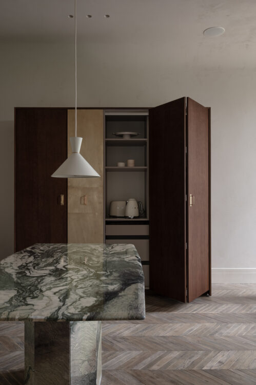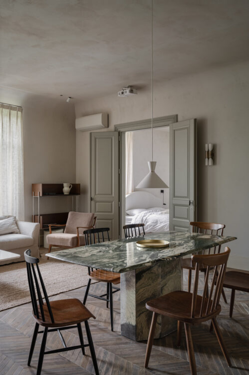 The apartment’s minimalist decor highlights the materials that were used… Wood and marble have been carefully selected for their delicate veins.