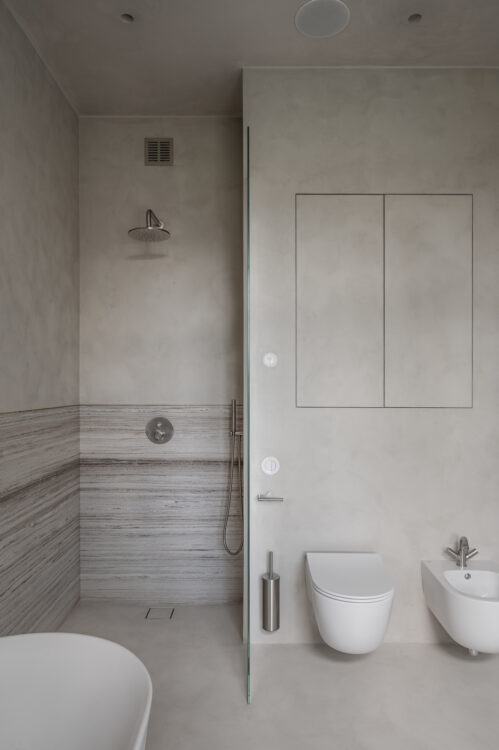 The walls and floor of the bathroom are covered with a micro-concrete coating, making it easy to maintain.