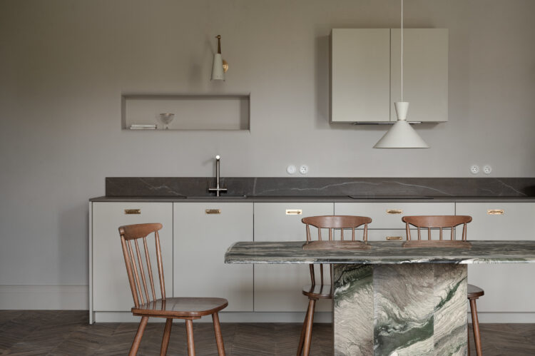 When it comes to lighting, Rina Lovko has chosen a variety of designer pieces. The wall light above the sink is by Antonio Adjustable, and the pendant over the dining table is none other than Warm Nordic’s Bloom model (1950).