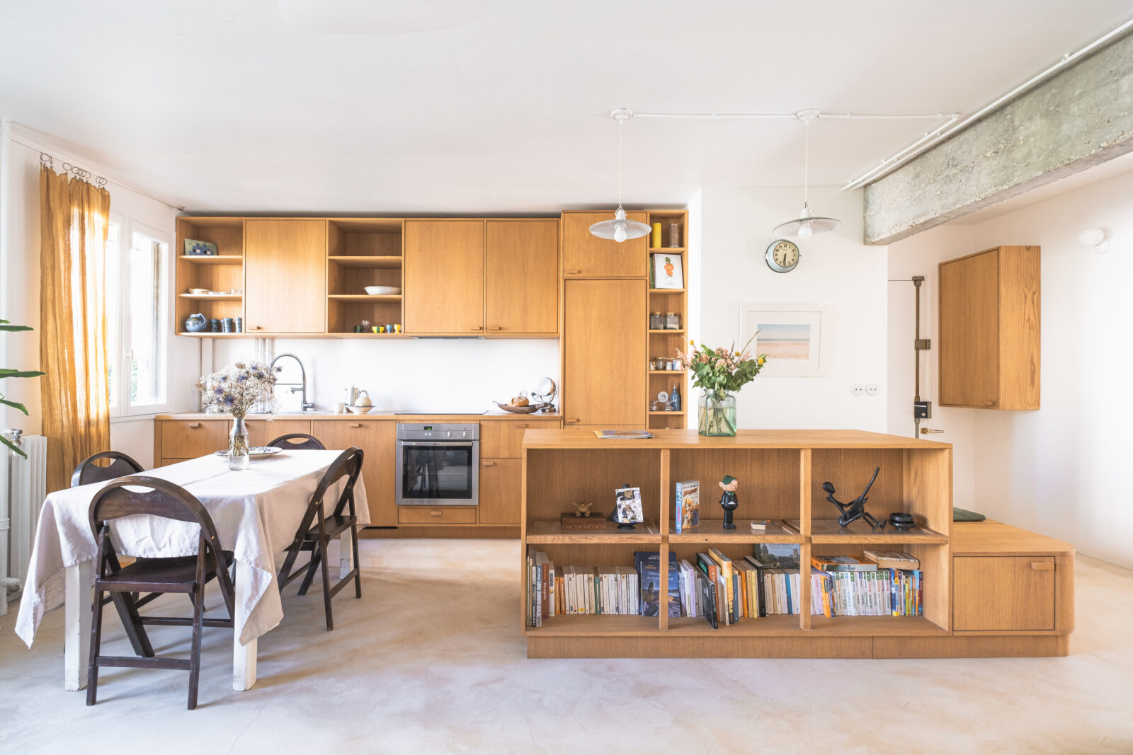 “ The apartment was in a state of disrepair. But the concrete structure was sound, with a generous balcony and plenty of light. “On the other hand, the layout, typical of the 1970s, was too compartmentalized. ” The apartment had six rooms for 60 square meters,” smiles Lucas. The aim was to clear out the clutter, let the light breathe and reveal the logic of the building. We didn’t touch the shell of the building, nor did we change the way it was used,” explains Gwendoline. . The idea was to keep to an approach of sobriety, functionality and economy of means. “The project is organized around an experimental approach based on reuse. Right from the sketch phase, R&D workshops were held with clients to identify sources of materials in Paris and the surrounding region. The circular economy strategy reconfigured every stage of the project,” says the architect. . Sourcing was done collegially from the outset. “Parquet flooring, radiators, insulation, plasterboard: anything that can be salvaged is. For the rest, the architect suggests organic or geosourced materials. “ This work was both an experiment and a demonstration of the potential and limits of reuse. It enabled the project’s stakeholders to develop a real collective intelligence. “she stresses.