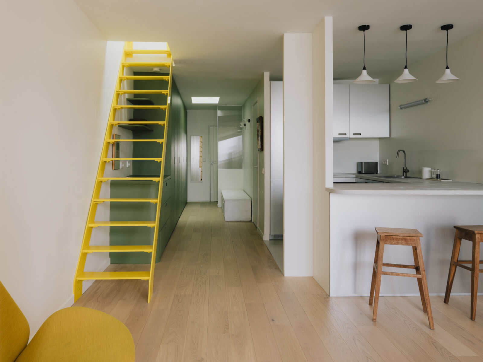 Focused on finding solutions, architect Margot Aurensan began by re-insulating the envelope, installing a ventilation system, and boosting the energy rating from G to C. That left the dark parquet flooring: with Virginie’s help, she replaced it to allow the rooms to breathe and provide a neutral backdrop for the family’s furniture. In the new color scheme, a sunny yellow brightens up the industrial staircase—now the centerpiece—while neutral tones give the other spaces a more relaxed feel, designed for occasional rentals as well as the owner’s stays in Paris.