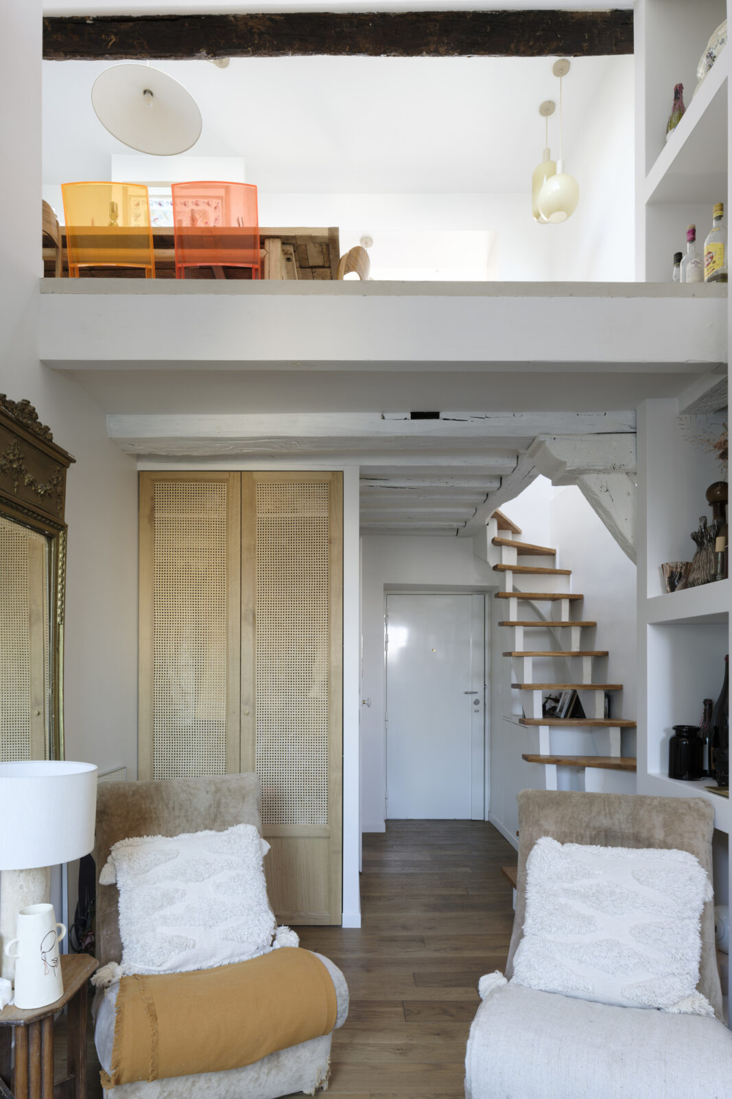 "Originally, this neighborhood wasn’t even on my list." Despite everything, he visited the apartment a second time with his business partner, who was able to see the duplex’s potential. The original layout, with the living room and kitchenette on the lower floor and the bathroom and bedroom on the mezzanine level, definitely didn’t fit with the couple’s lifestyle. The space felt dark and the fittings were out of date. But the exposed solid oak beams and double-height ceilings had plenty of potential, while upstairs, a lovely surprise was hidden behind the wooden panel: a small, west-facing terrace. Overlooking the glass ceiling of the famous Galerie Vivienne, the Paris Opera and Sacré-Cœur, the views were simply breathtaking. That’s the moment everything clicked into place for Raphaël: