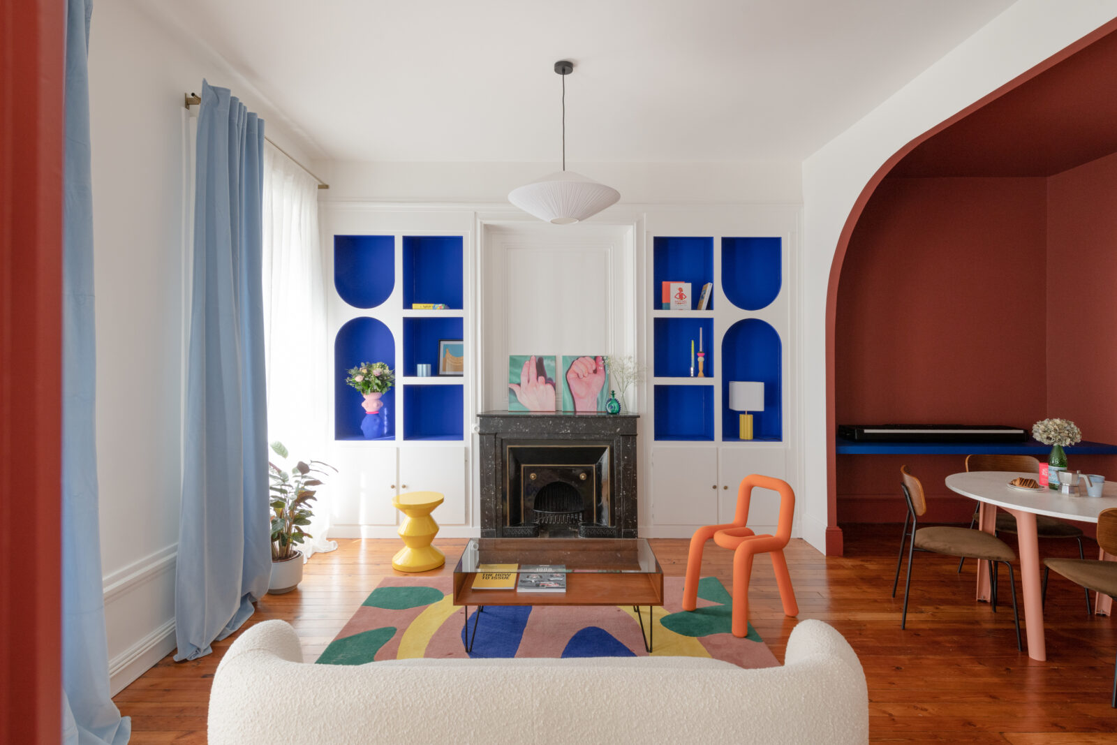 As a result, the eye revels in the interplay of hues and the simple geometrical shapes, all fiercely reminiscent of the Memphis style, whose maximalism, multicolored whimsy and bold lines turned the design world upside down in the 1980s. “We’ve also made a point of revealing what already exists, as we often do with parquet flooring, stone, French ceilings. We try to match these elements with the materials we bring into the mix. This accumulation of elements brings a certain life to the room.” All this is complemented by seventies inspirations, which break with the Scandinavian trope and give this colorful apartment its distinctive character.